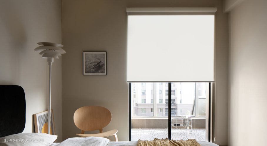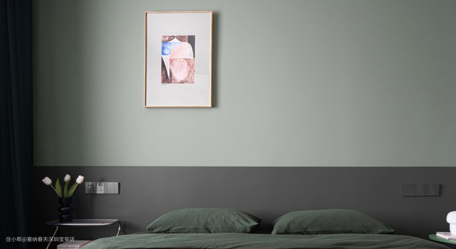 主卧采用无床头设计,上半墙是与客厅同样颜色的涂料,下半墙是深灰色的黑板漆,黑板漆相对于普通的涂料更加耐刮擦,方便打理,同时节省预算