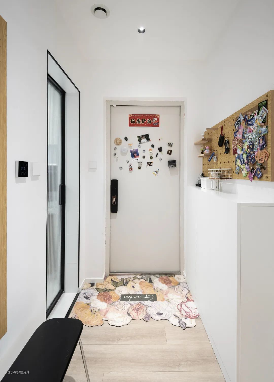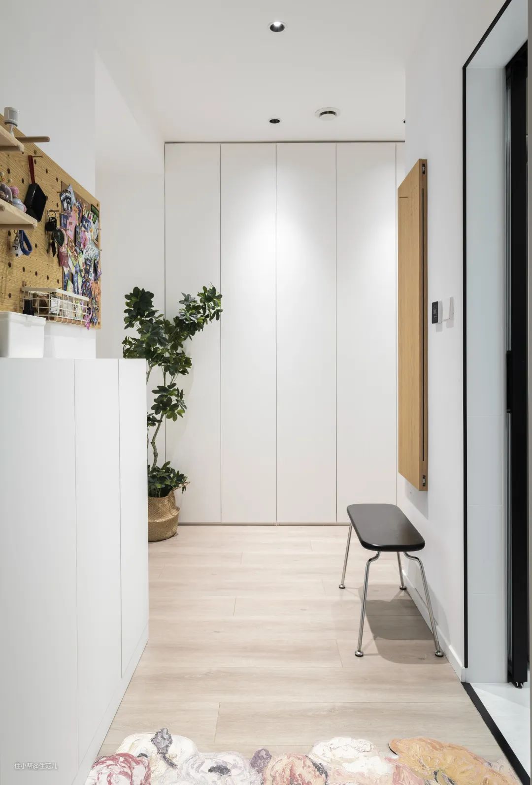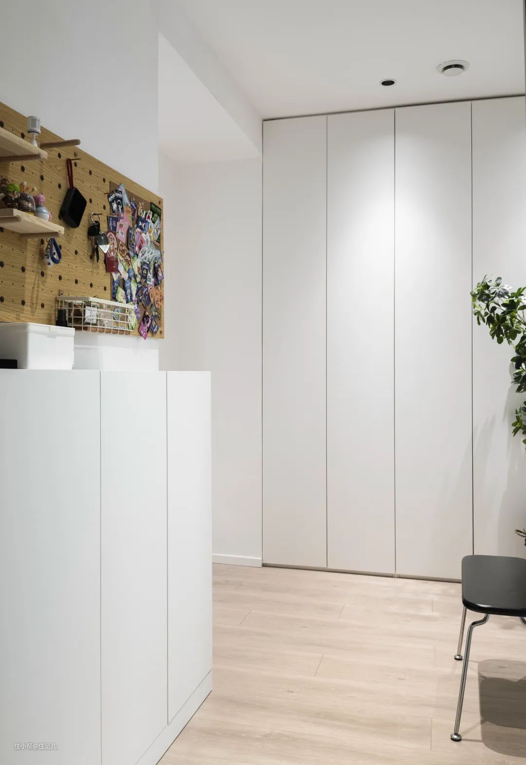 虽然入户门右侧预留的门垛尺寸有限,但屋主夫妇并没有浪费此处空间,定制了进深 18cm 的储物柜,一侧用来隐藏弱电箱和放置光猫、路由器,另一侧收下家里常用的低帮鞋和拖鞋。 上边再安装洞洞板,用来收纳体积小的物品,方便进出门时随手拿取。