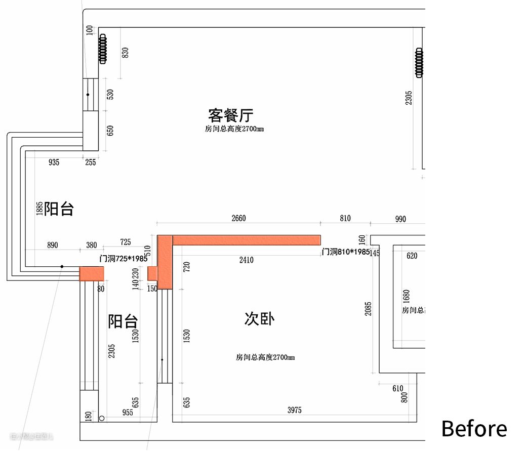 对比其它功能区,客餐厅的改造范围较小,仅是填补了与原次卧相连的阳台门洞。