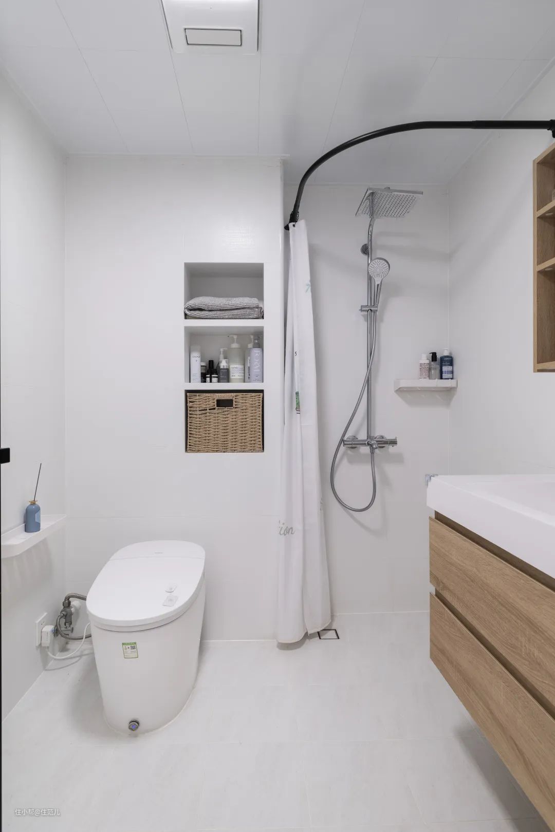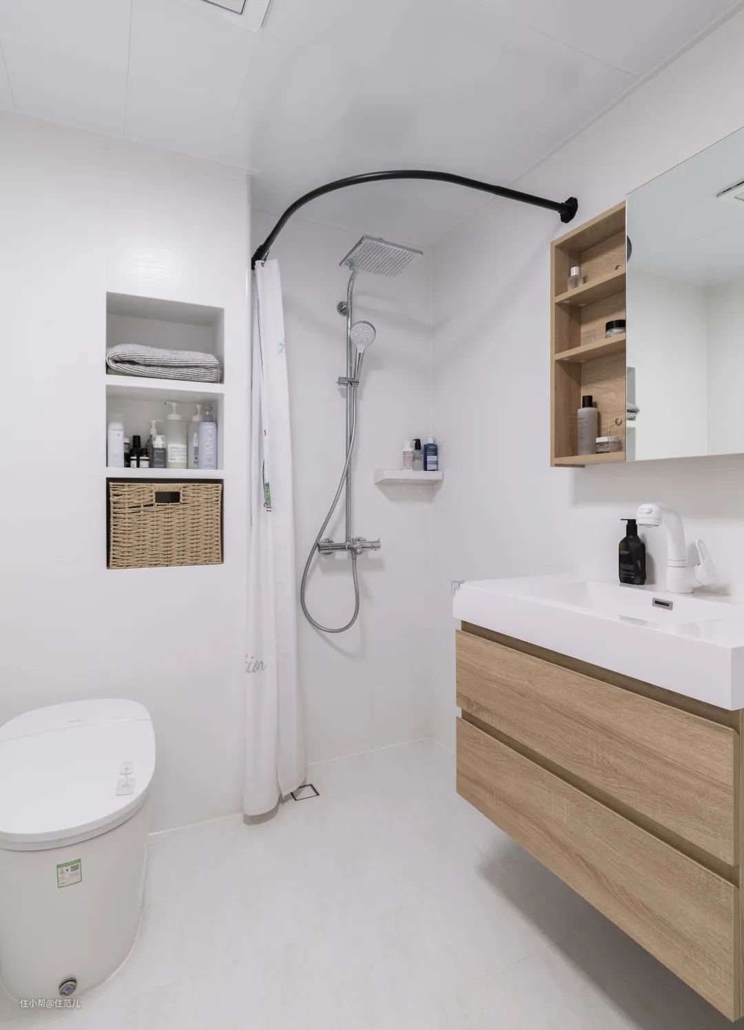 两位屋主都不太喜欢淋浴房,便采用浴帘隔开进行遮挡。 虽然挡水效果会有折扣,但地面无障碍物,日常打扫也会很方便。