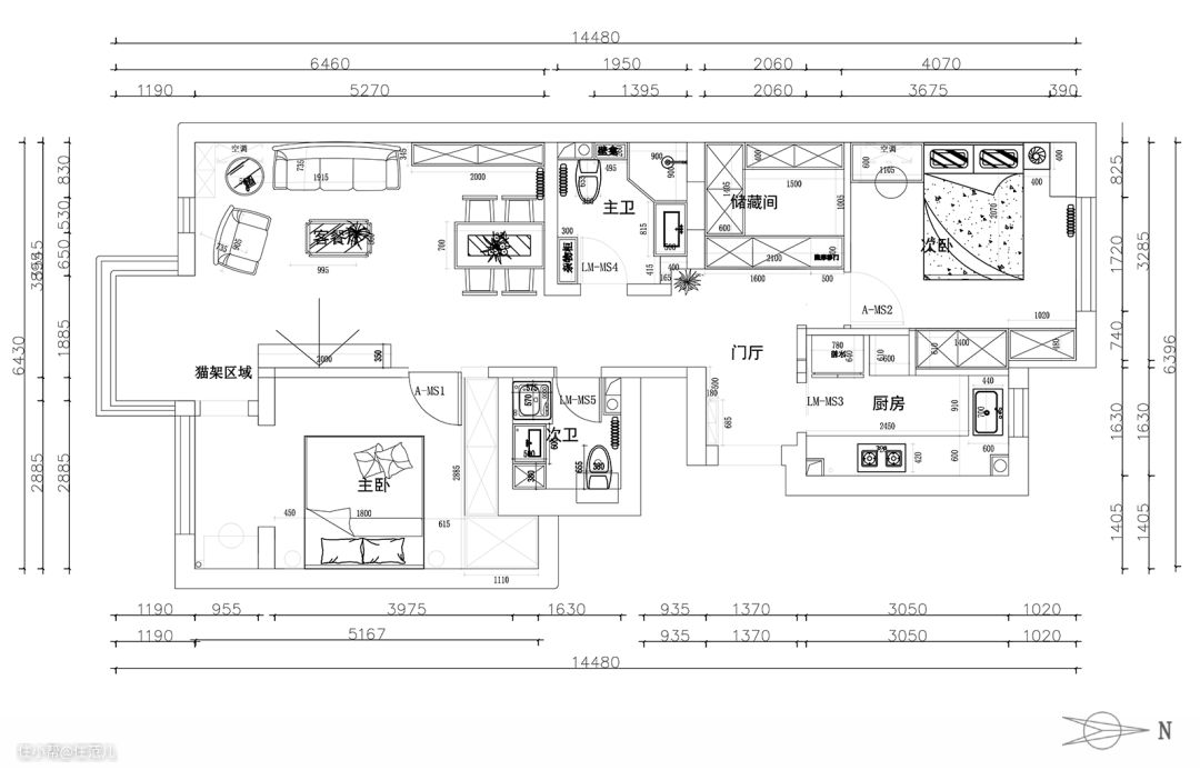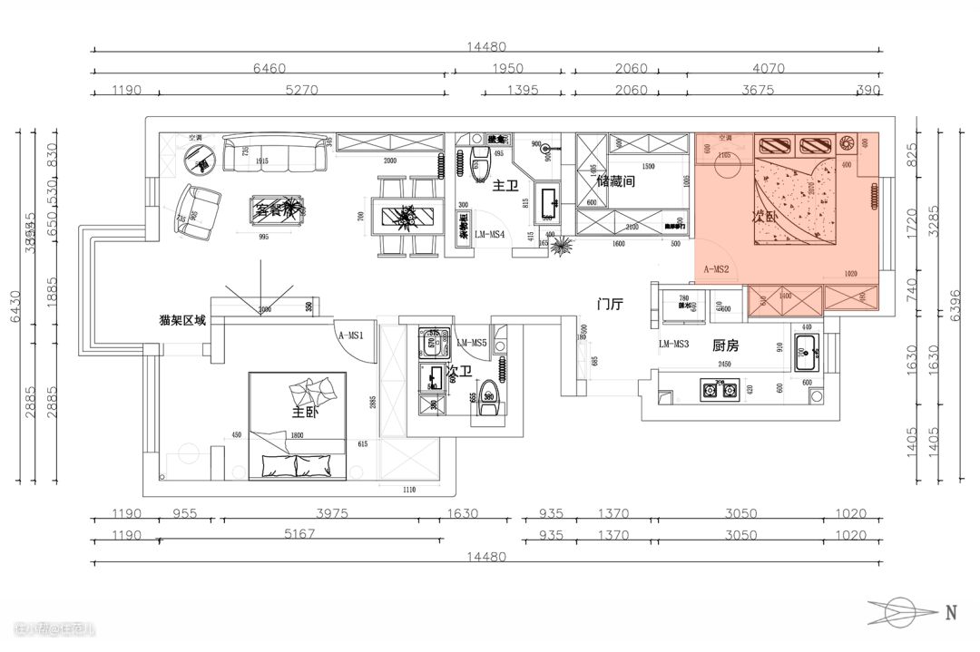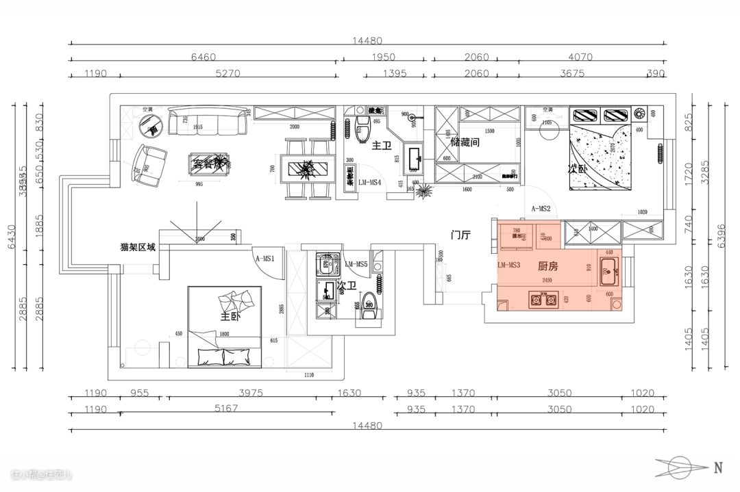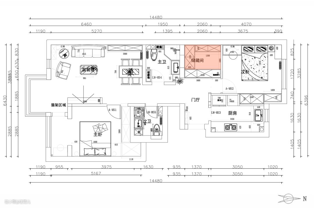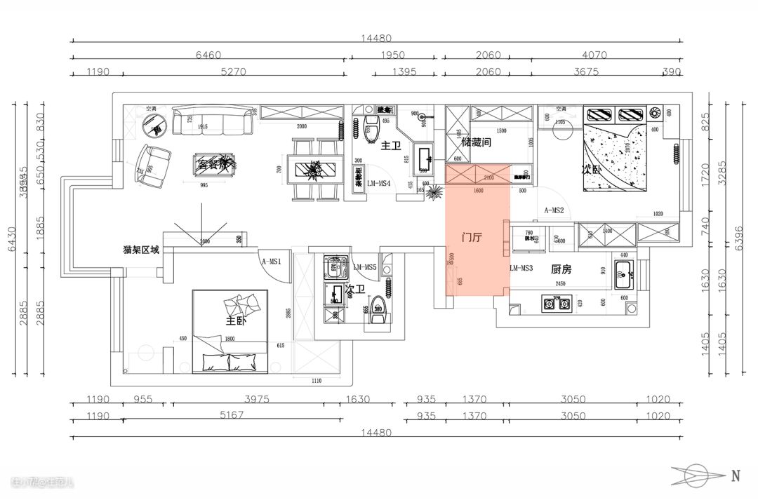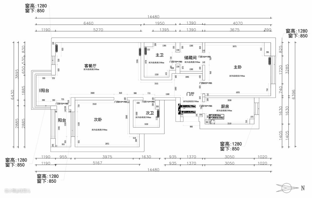 南北朝向、双阳台、双卫、主客分区、储藏间,这套由史先生和太太置办的两居室,拥有了很多先天优势。 但细看之后,还是能戳破一些「户型泡沫」: ● 厨房面积小是硬伤,收纳、操作空间均不足; ● 储藏间左右两侧的墙体均被门洞隔开,收纳容量「大打折扣」; ● 阳台空间狭窄,实际利用率不高; ● 受门洞限制,次卧缺少合适的储物空间。