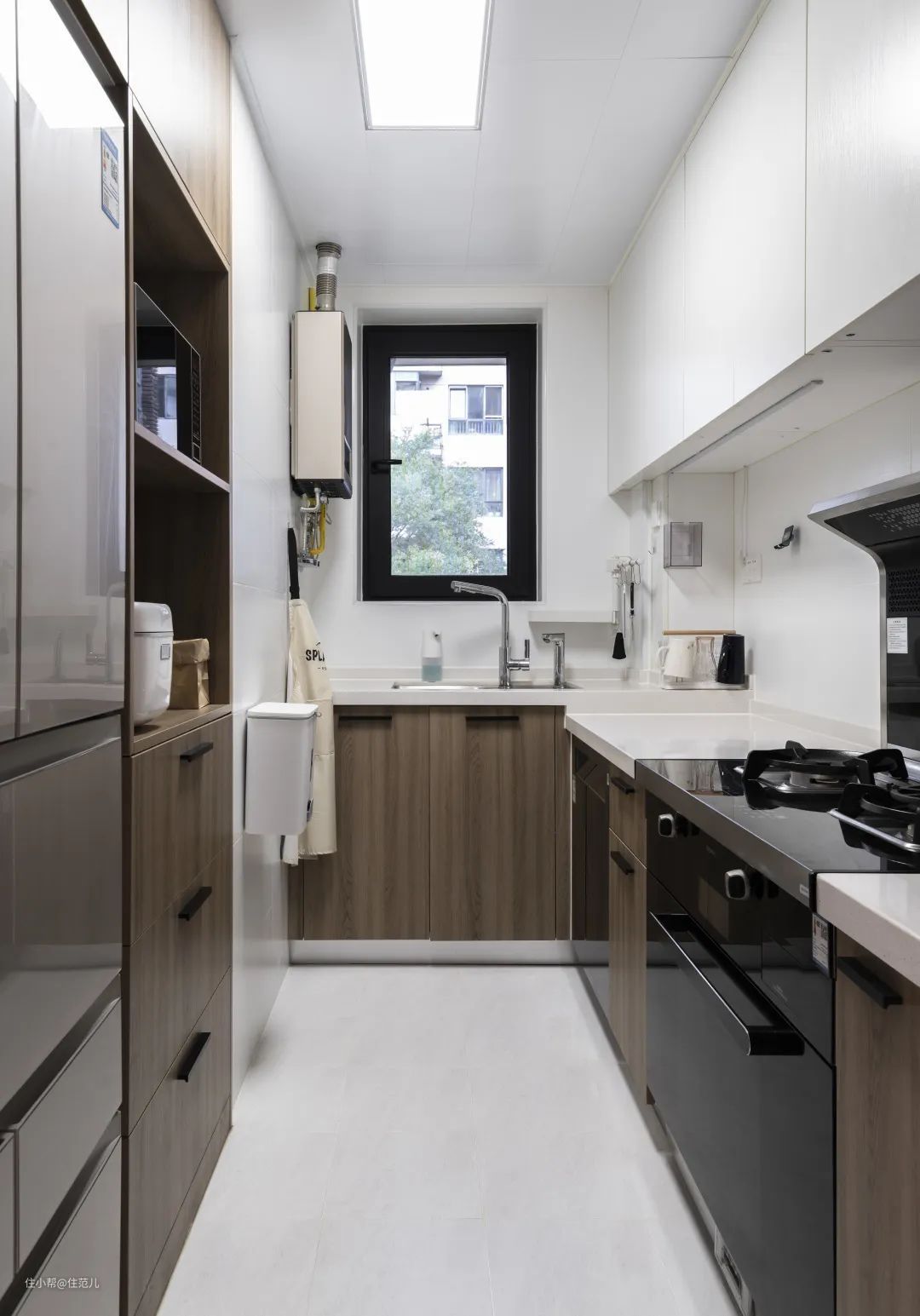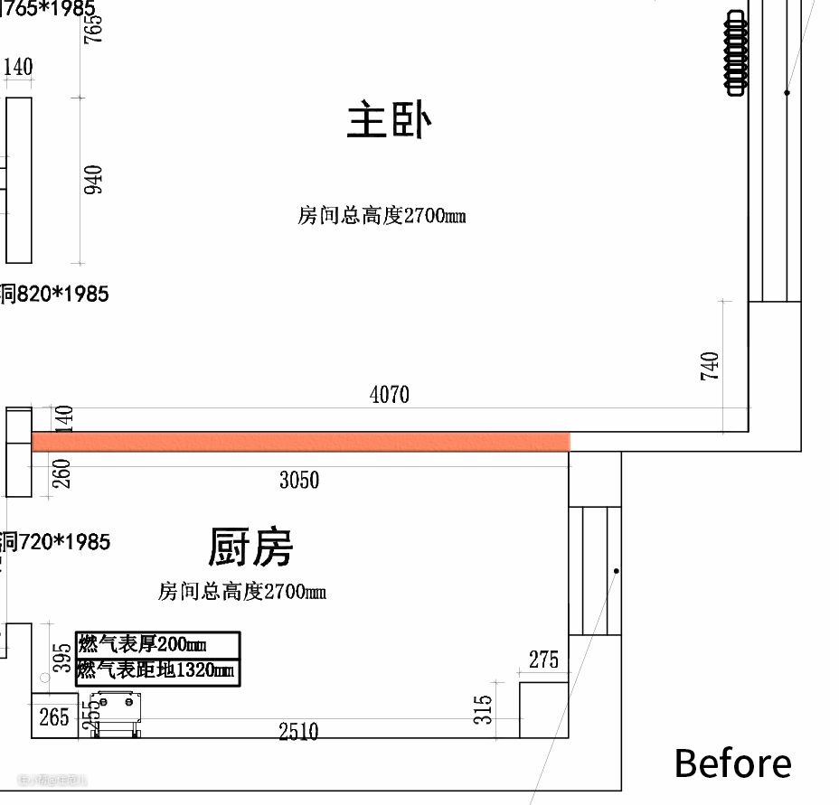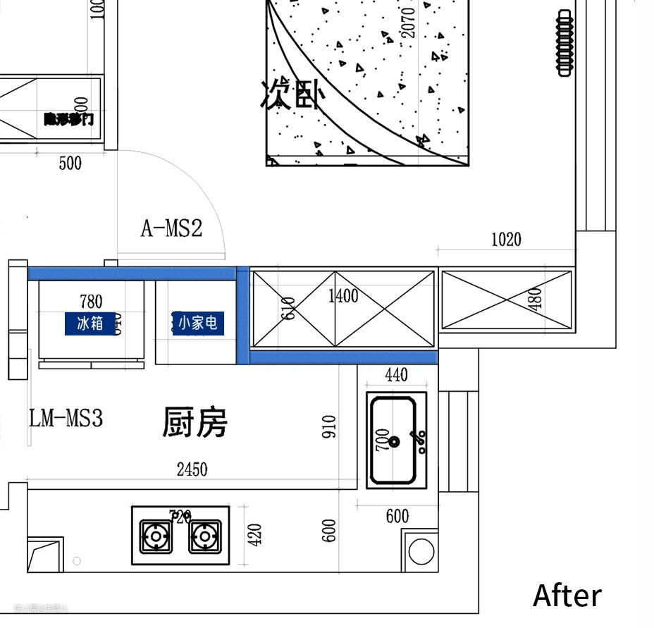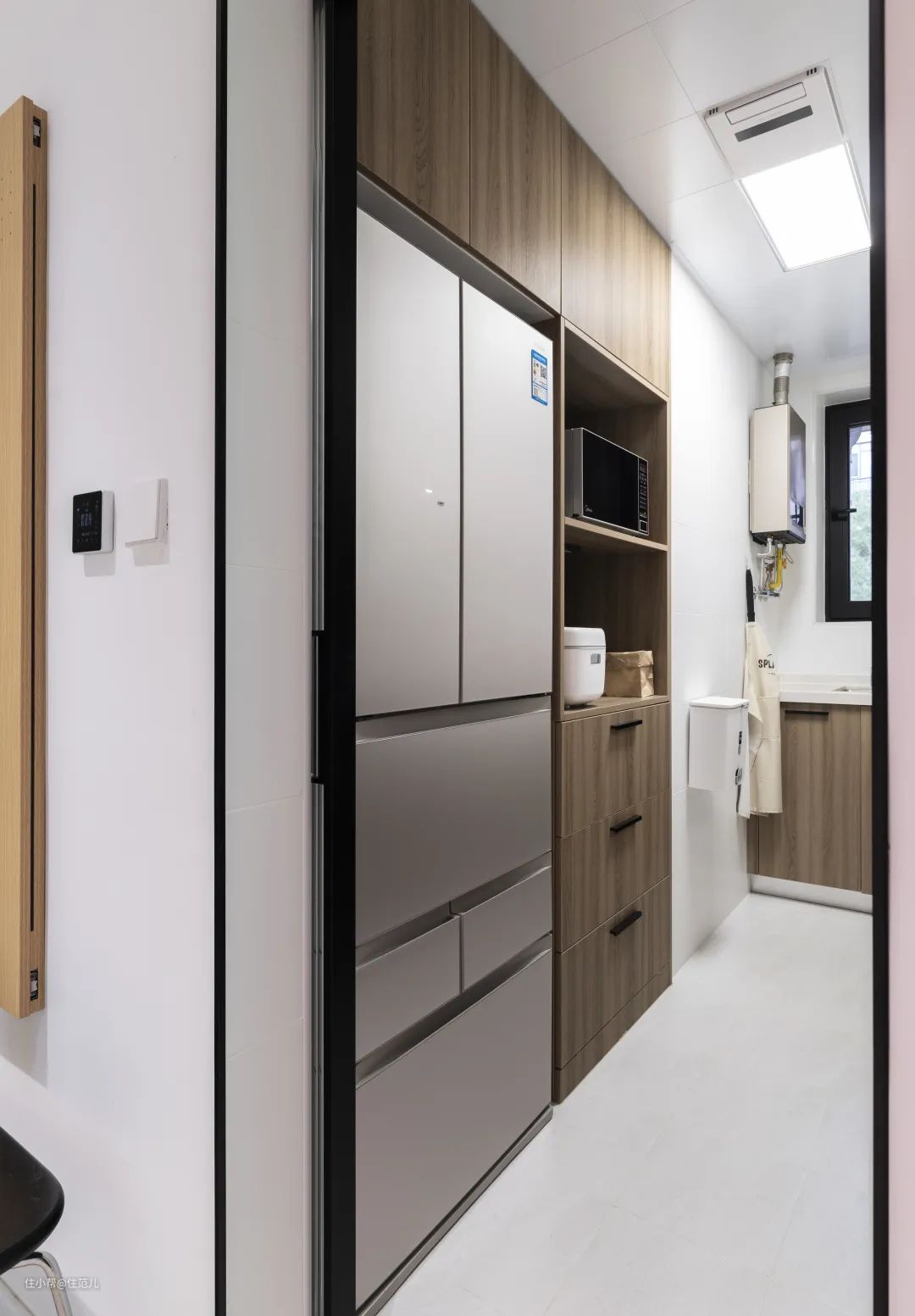 原厨房的面积仅有 4.5㎡,且碍于右侧门垛的尺寸,不仅无法规划出 U 型格局,连冰箱放哪里都成为一个大问题。 设计师刘杨杨决定借用一部分原主卧的面积,规划出进深 61cm 的 Z 字形隔墙,塞入冰箱、储物柜后,墙体正好能被拉平。