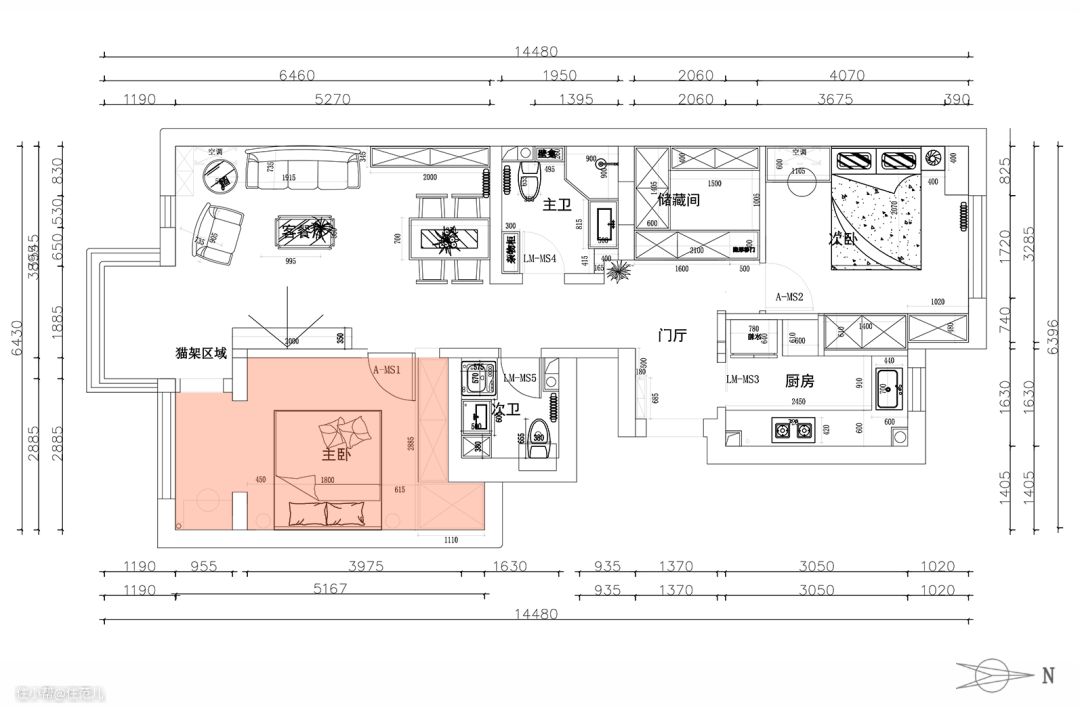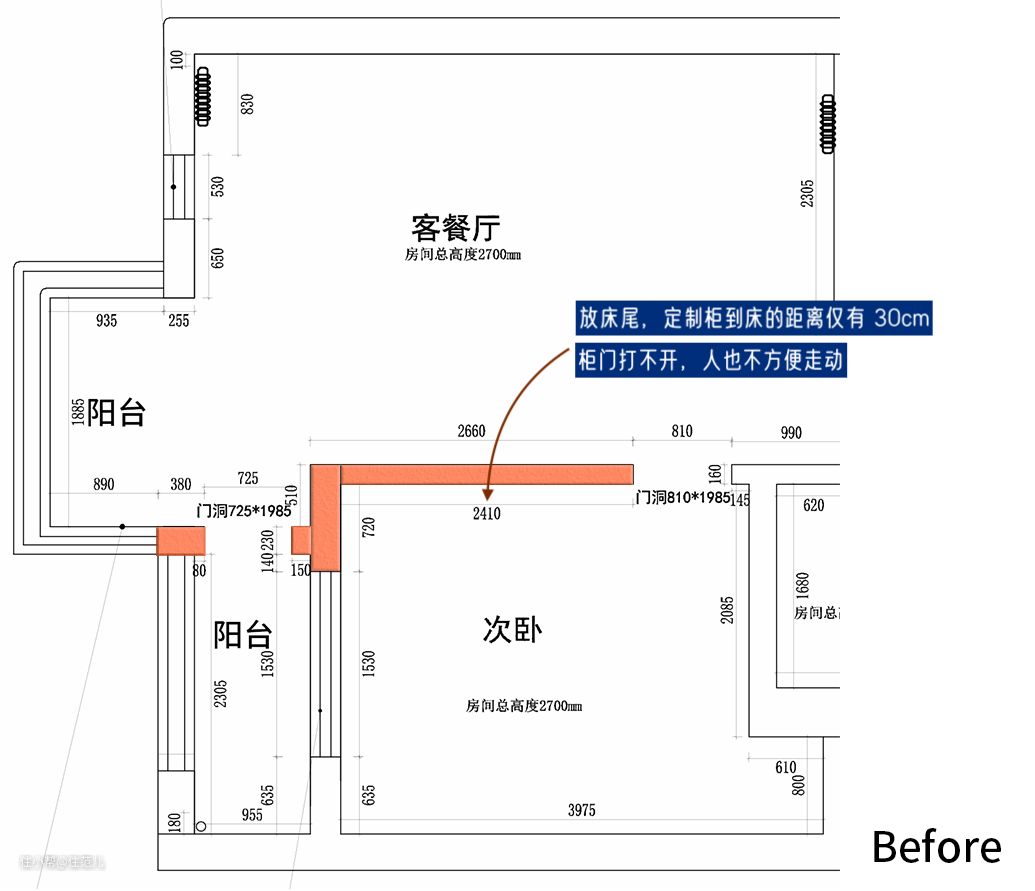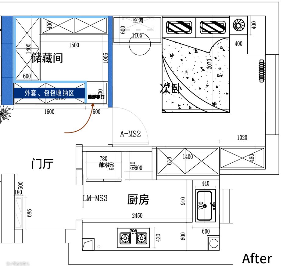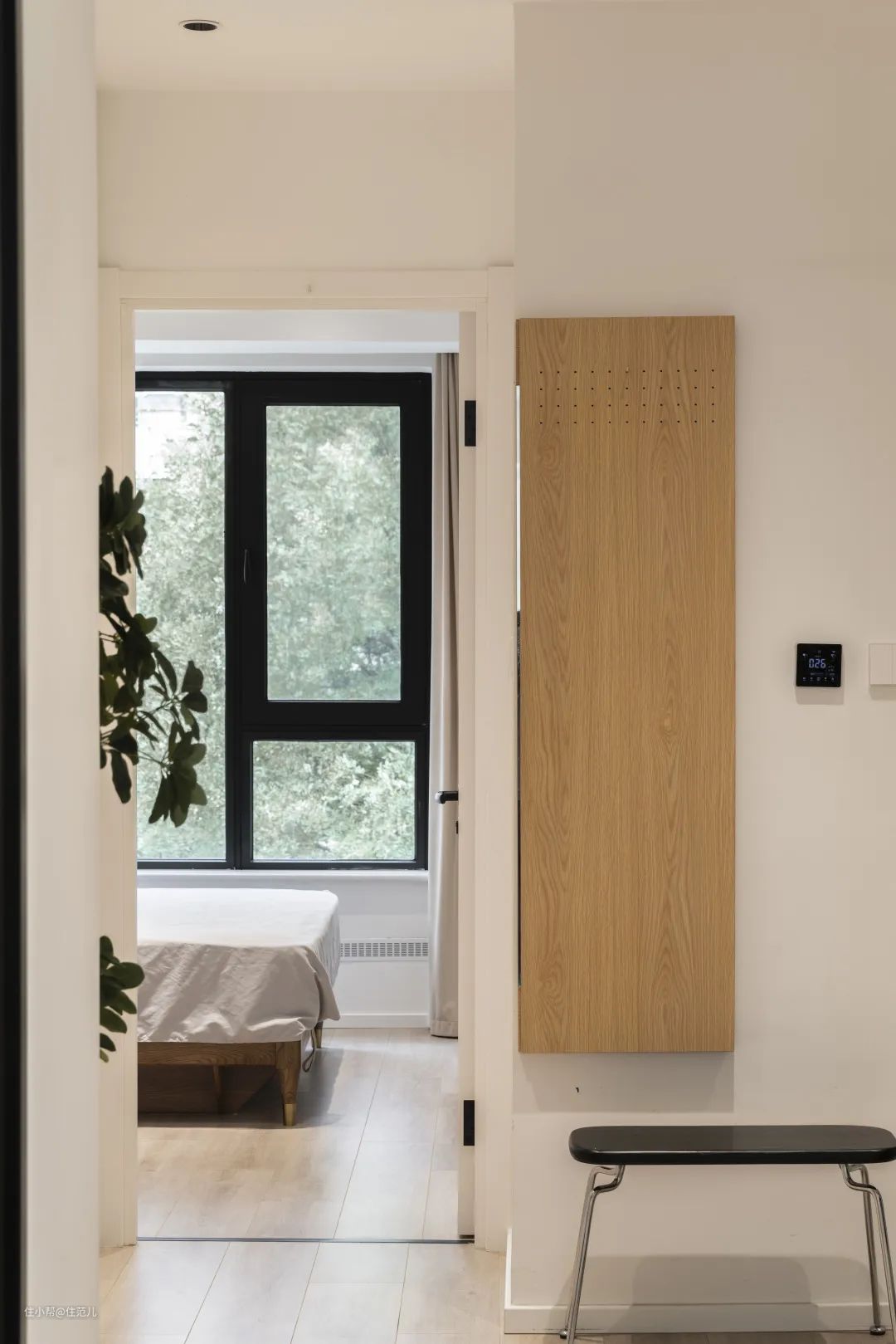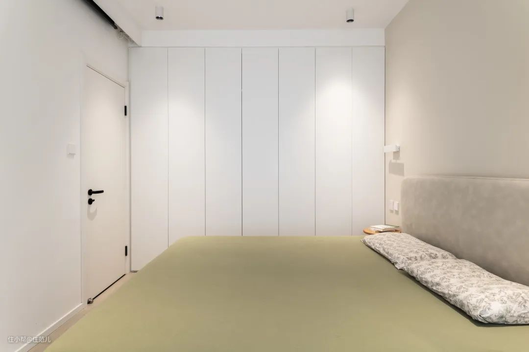 调整门洞位置后,主卧得以有空间布置整墙通顶柜,不再像以前一般,只能塞入墙边的凹角里。
