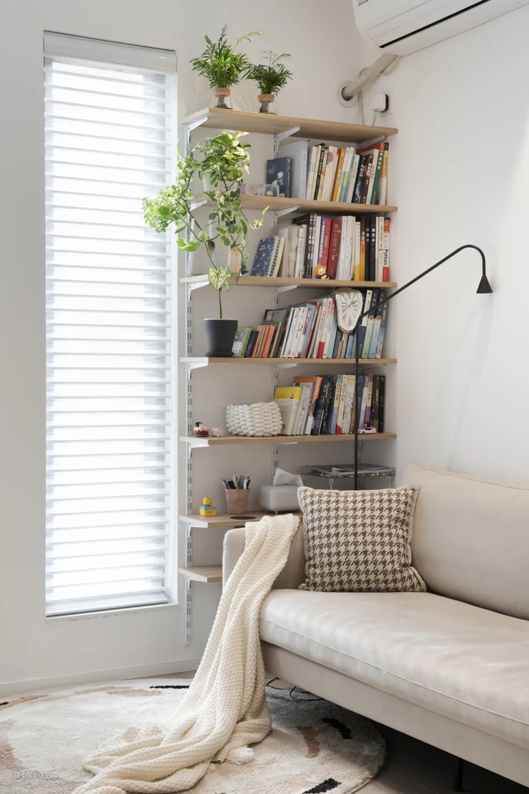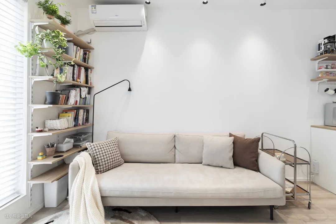 客餐厅为南向采光的缘故,阳台、书架已被史先生养护的绿植所「占领」,叶片也被精心地调整至窗前。 阳台花架上布置了植物补光灯,若碰上连续阴天的天气,可以打开为绿植照射。 史先生说:「补光灯最好买物理开关的,这样可以用智能开关控制,方便和光照传感器联动。」