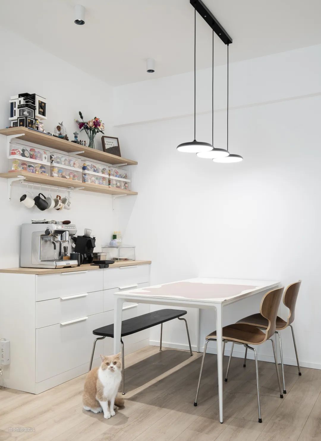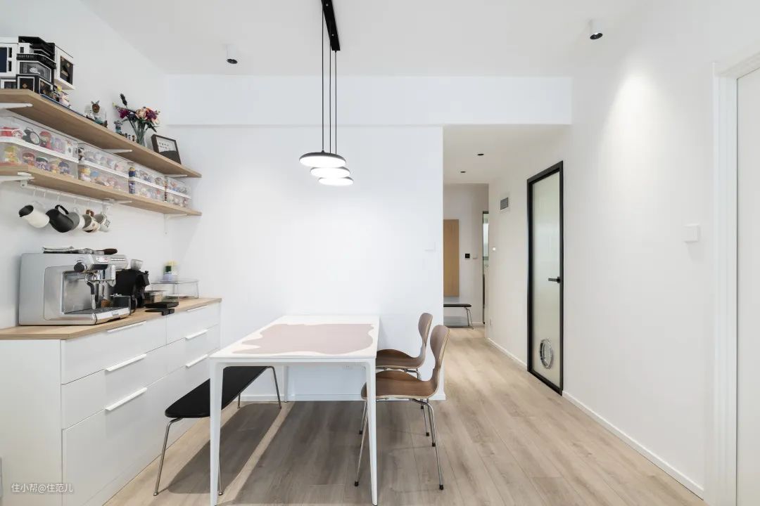 史先生和太太都喜欢喝咖啡,因此专门在餐桌后边设计了宽 160cm、深 40cm 的餐边柜,存放咖啡机及相关的器具。