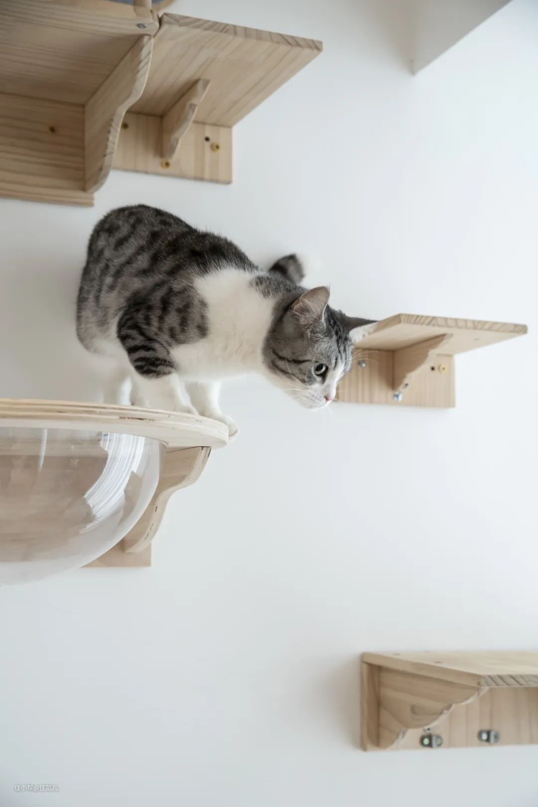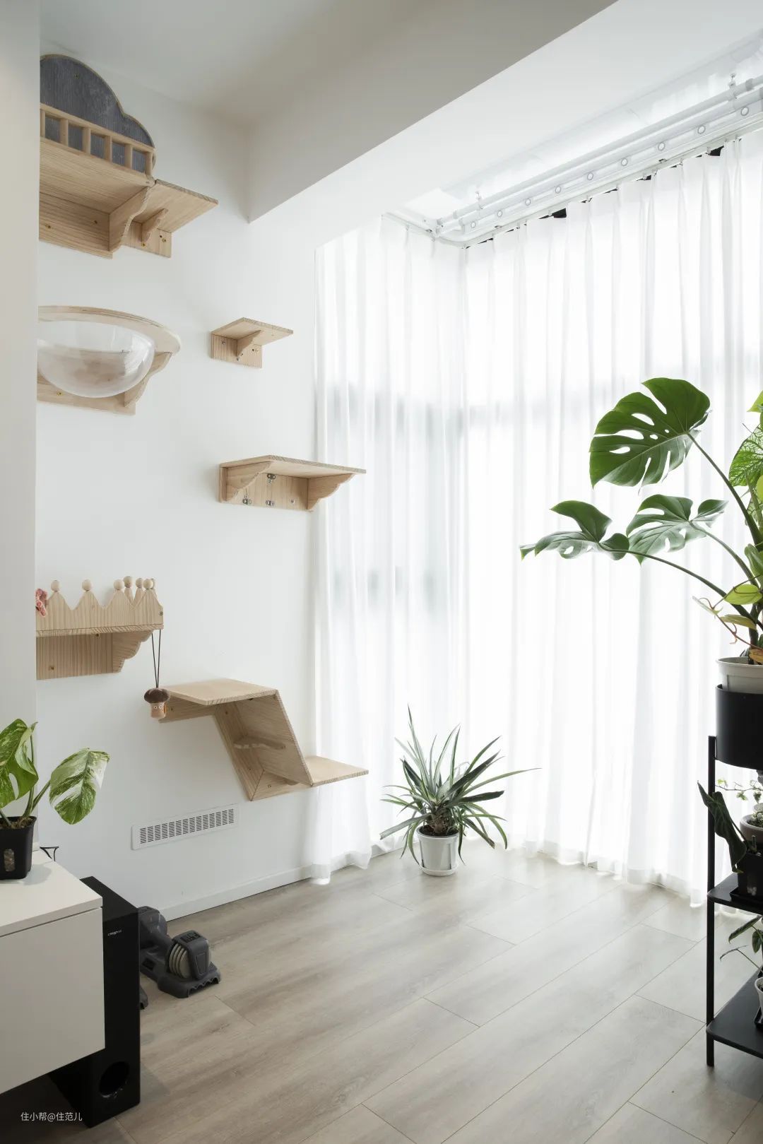 被封上的次卧阳台门洞,现在装上了猫咪爬架;旁边的主阳台顶部配有晾衣架,需要时即可拉下使用。