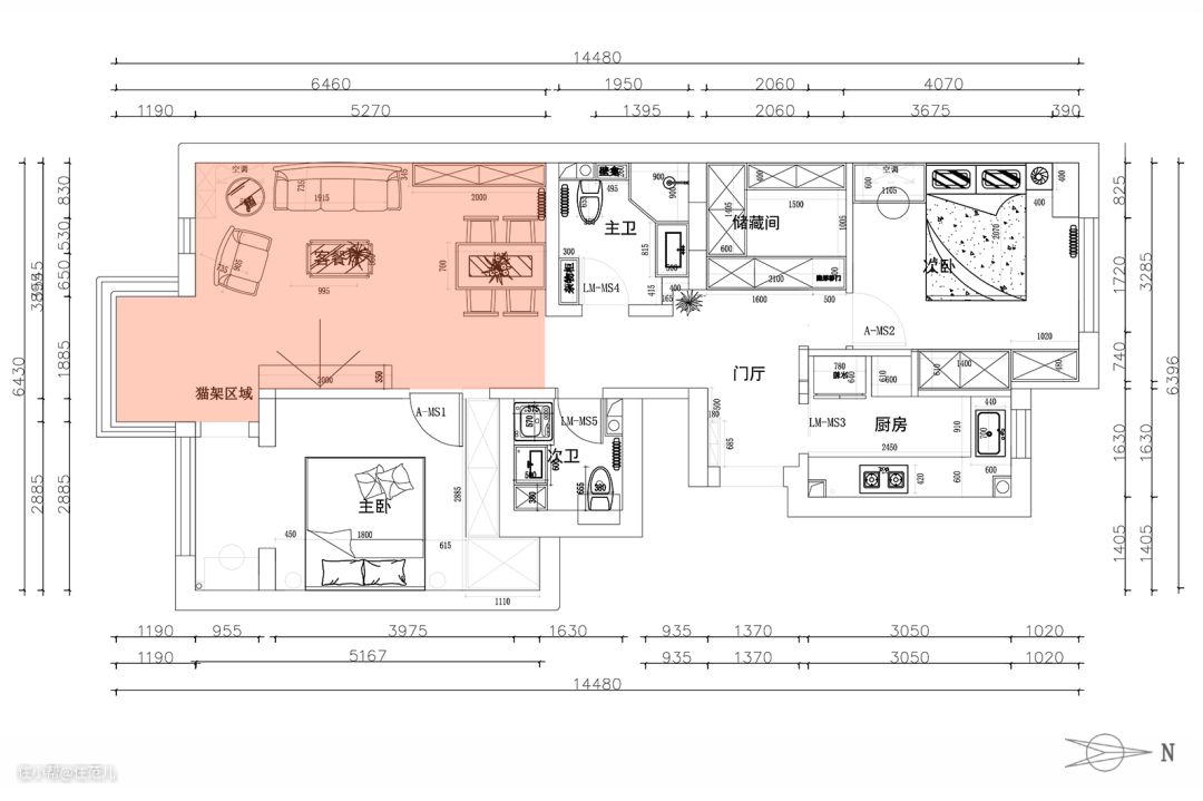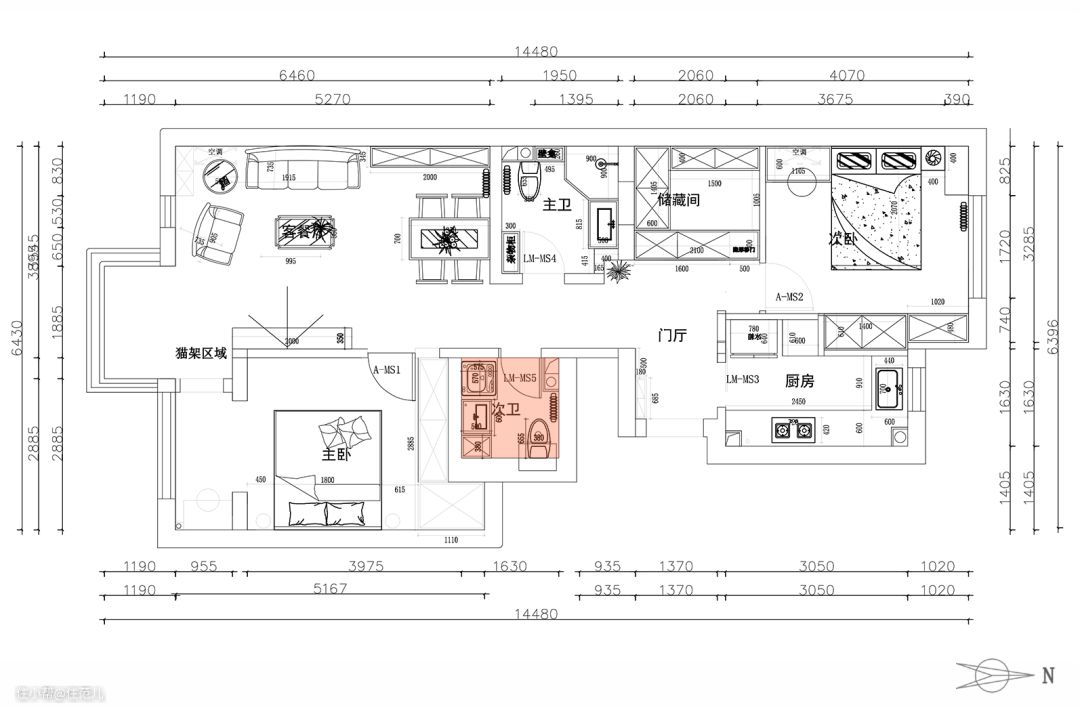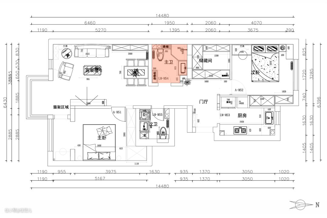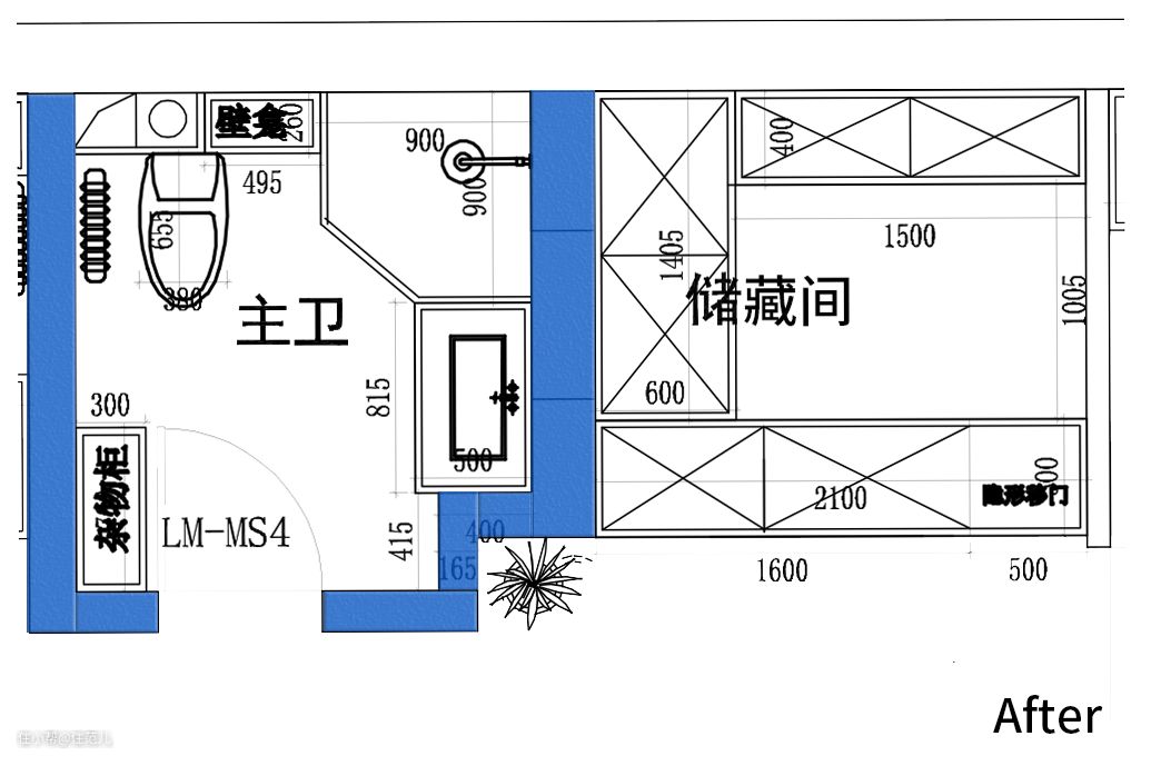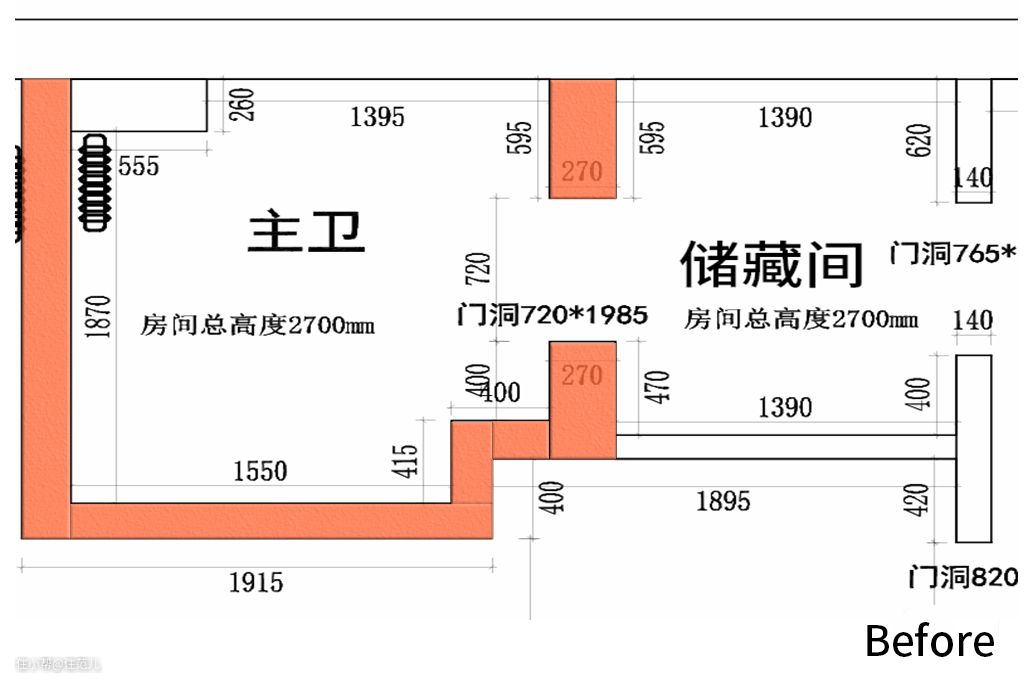 经过前期勘测,设计师确认主卫门洞的位置能改到朝向过道一侧,便将其与储藏间隔开。 这样主卫内部的空间能被独立规划,所产生的潮气也不会影响到储藏间。