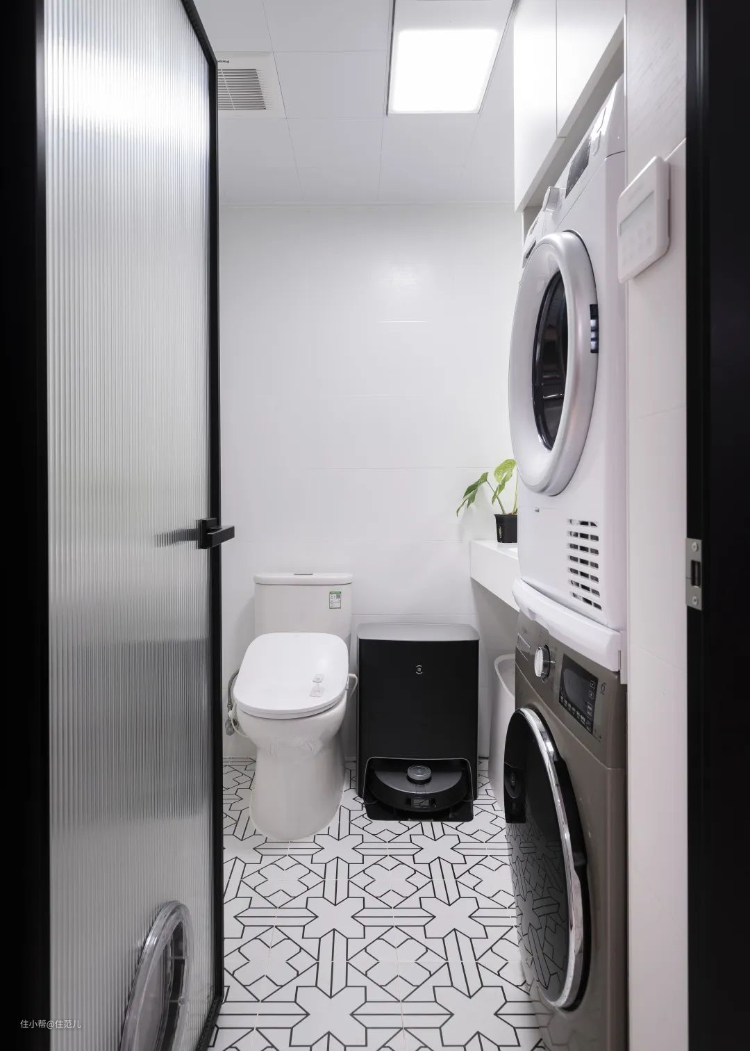 洗衣机和烘干机被安排在次卫中,上边安装到顶的储物柜,就近收纳洗衣用品。 另外,考虑到有存放扫地机器人、猫砂盆的需求,屋主夫妇将洗漱台高度定在了 90cm。