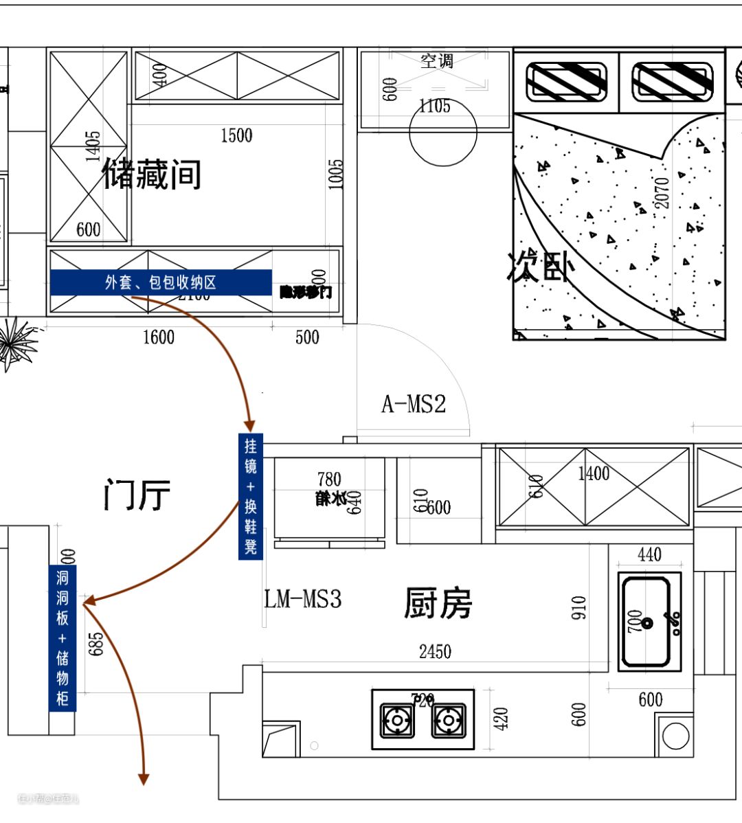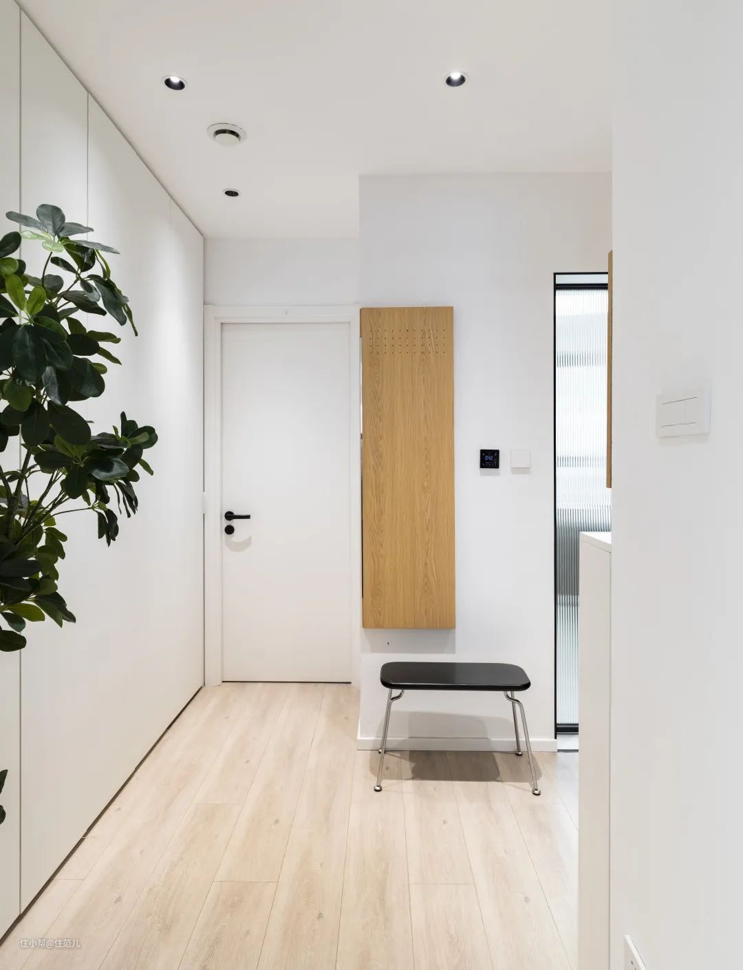 正门对着的储藏间,内部规划出了外套、包包收纳区,旁边为穿衣镜和换鞋凳。