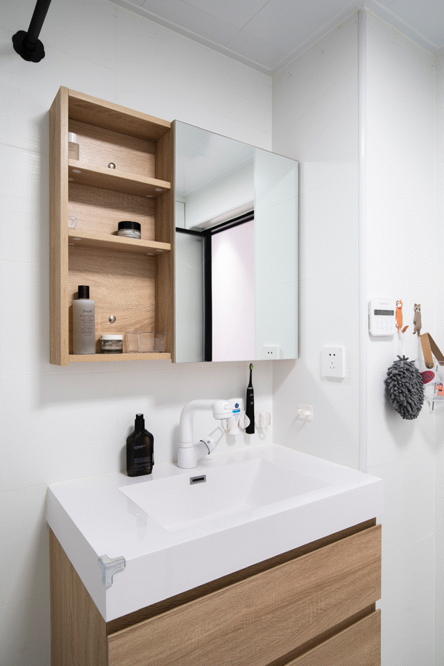 浴室柜并非成品,是屋主夫妇在测量自己常用物品的高度后,选择在网上定制的。 镜柜至洗漱台的高度有讲究,刚好能竖着放下电动牙刷;需要充电时,内部也留有插座。 史先生分享,自家网购还是比较顺利,浴室柜从设计到安装都没有出现返工的情形。