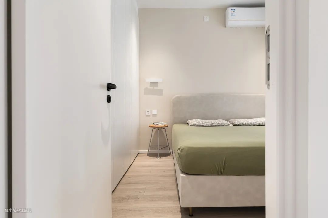 关于床边杂物的收纳,屋主夫妇舍弃了笨重的床头柜,改为放置椅子和窄缝储物柜,视觉上看着整洁,拿取也便利。