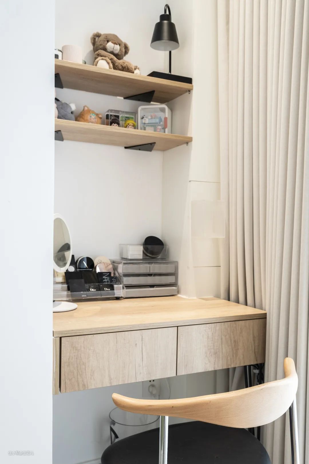 除了调整门洞,主卧还将阳台纳入其中,增加使用面积。采光好的缘故,这里也被用作太太的化妆区。