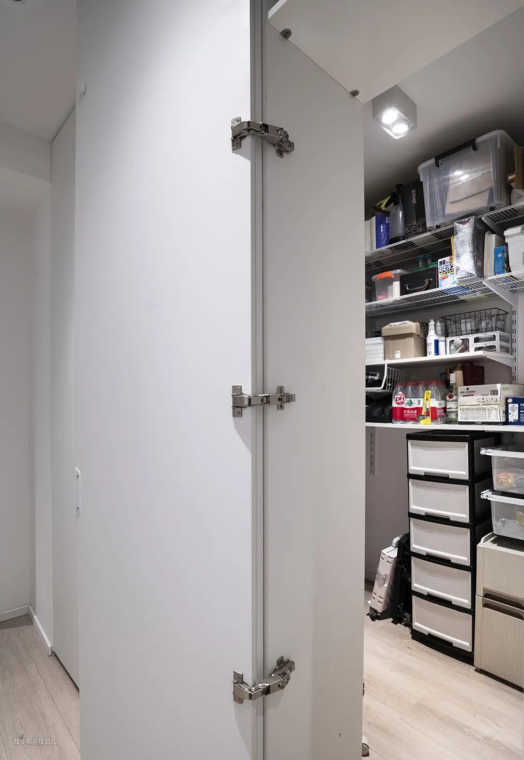 原本它被纳入主卧之中,同时连接着主卫,只有两面墙体能布置定制柜或者储物搁架。 住范儿在后期改造时,封上了两边的门洞,将主卧、储藏间、主卫变成三个独立的功能区。 同时化用 Z 字形隔墙,分割出外套收纳区和入口,加上门板后,从外边看完全想不到内里有如此多门道。