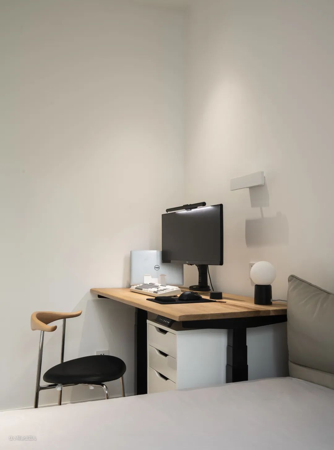 办公桌为升降设计,坐累了能随时切换到「站立办公」的形式。 显示器前安装屏幕挂灯,其实是很好的布光方式,比旁边摆放台灯更有用。 因为显示器的亮度会比其他灯具亮,这样会与周围产生「亮度高对比」的情形,长期在此环境中,眼睛更容易感到疲劳。
