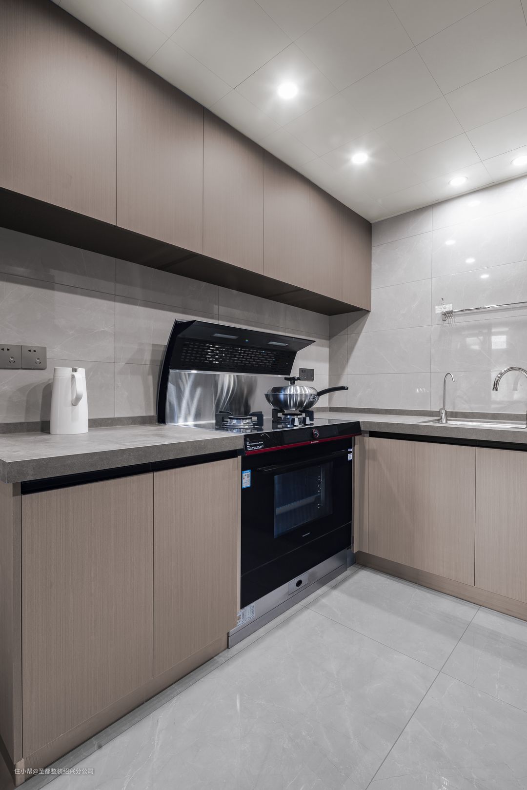 原户型中,留给厨房的空间不大。设计师通过调整户型、开放式布局、动线优化,形成了女主人心爱的厨房,不仅空间得到扩大,还拥有超强的储物能力,能轻松囤下粮油和零食。