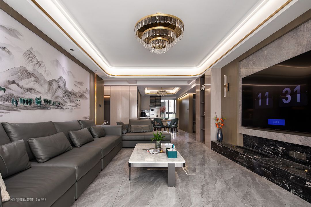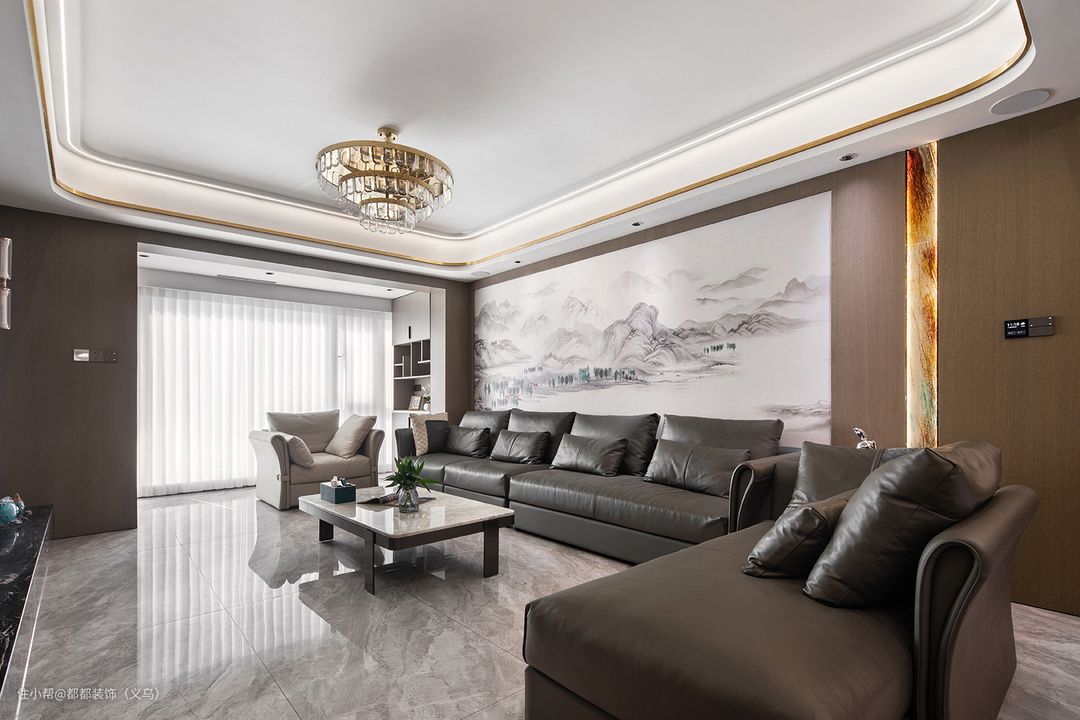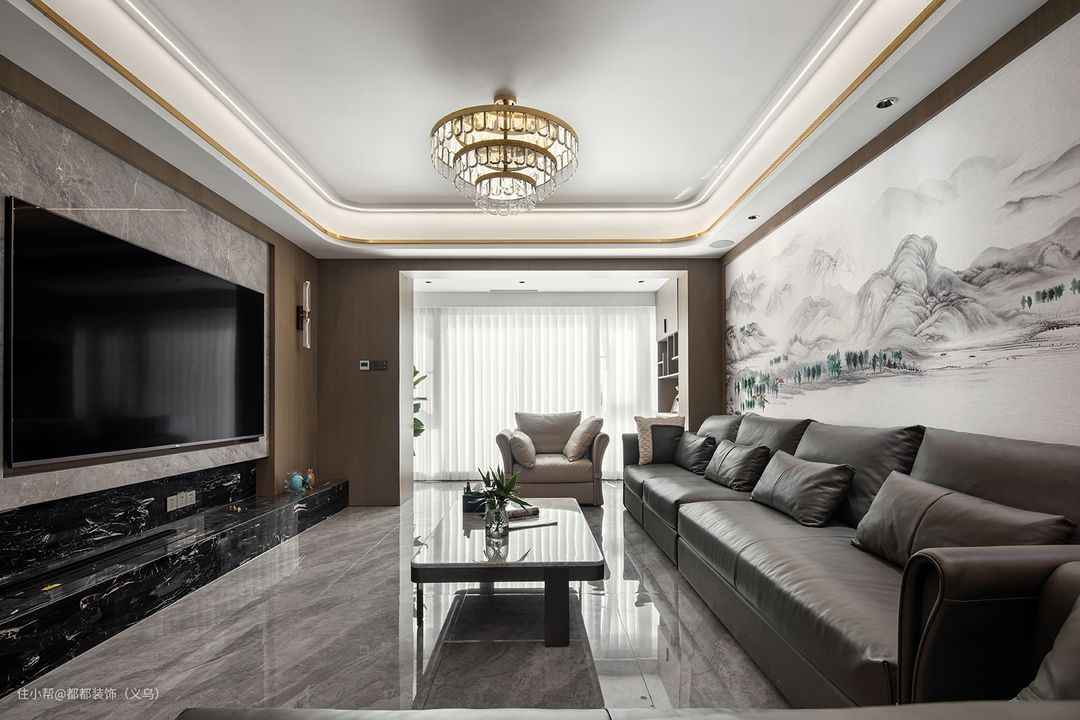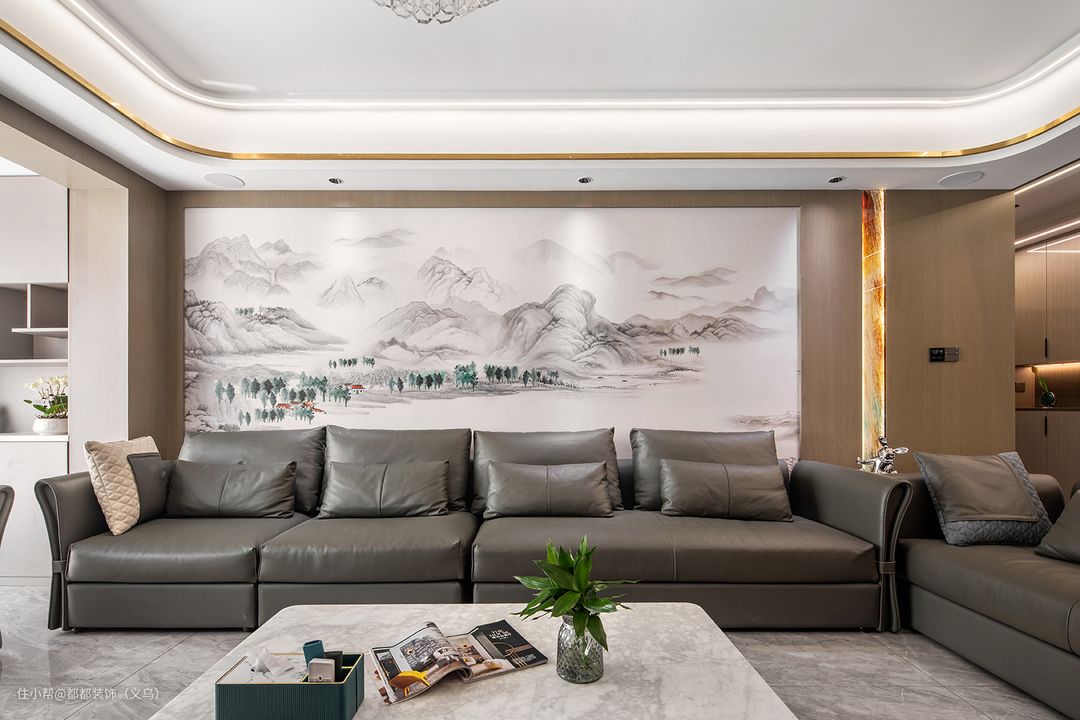 想要给客厅营造一个既现代又文艺的氛围感,不妨试试将山水画搬上背景墙吧!这不仅是独特的视觉享受,还让整个家具有满满的文化气息。