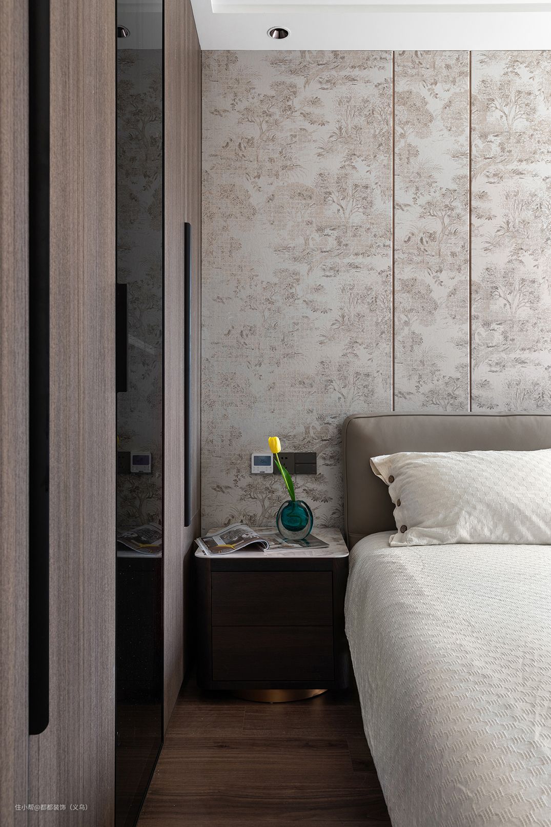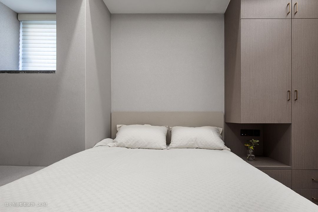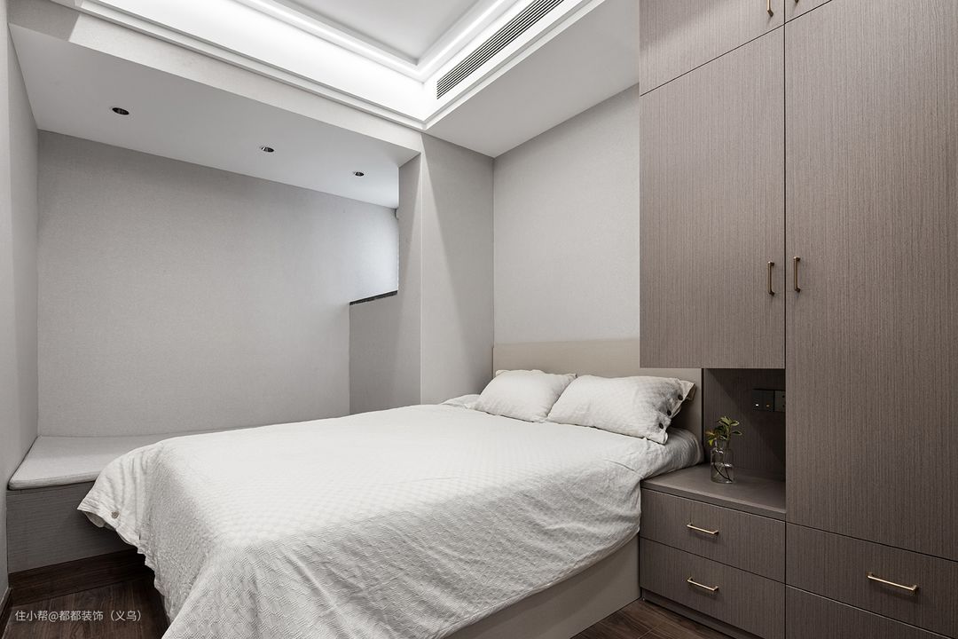 迷你的卧室也能拥有强大的储物功能,衣柜内凿一块空间作床头柜使用,让衣柜的功能百变又具有多样性,内敛的用色与极简的装饰,让整个房间呈现出克制的高级感,原木家居的大量使用搭配棉麻轻柔的床上用品,为休憩空间带来舒适静谧的体验。