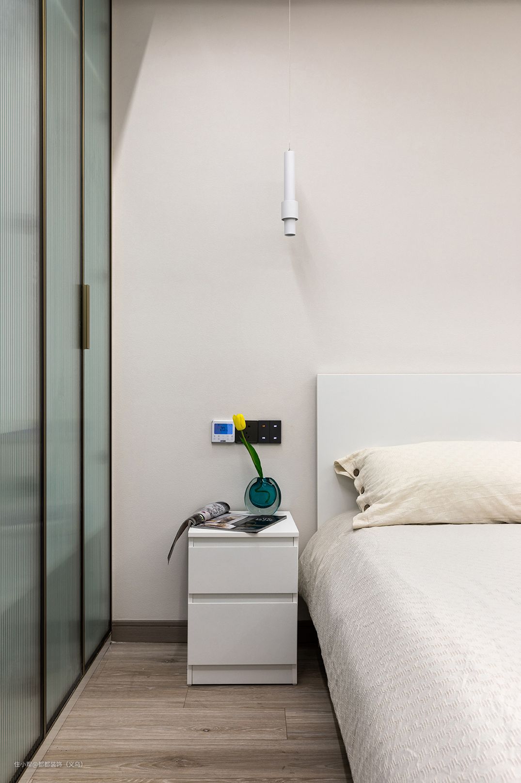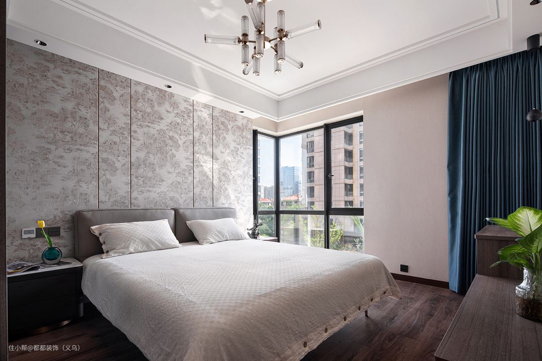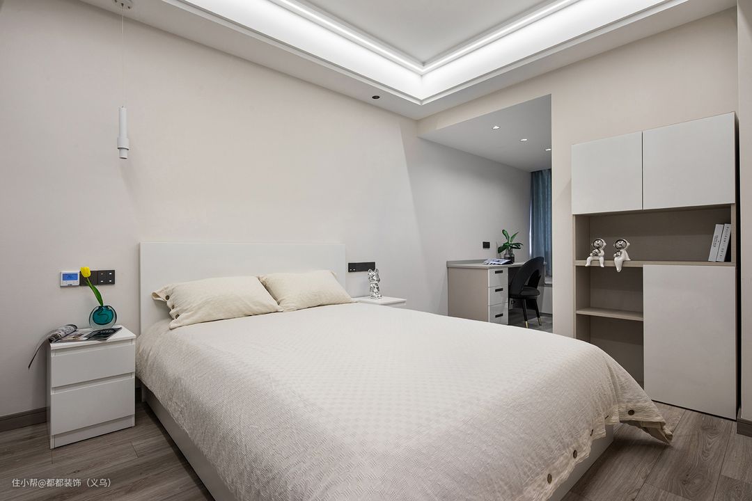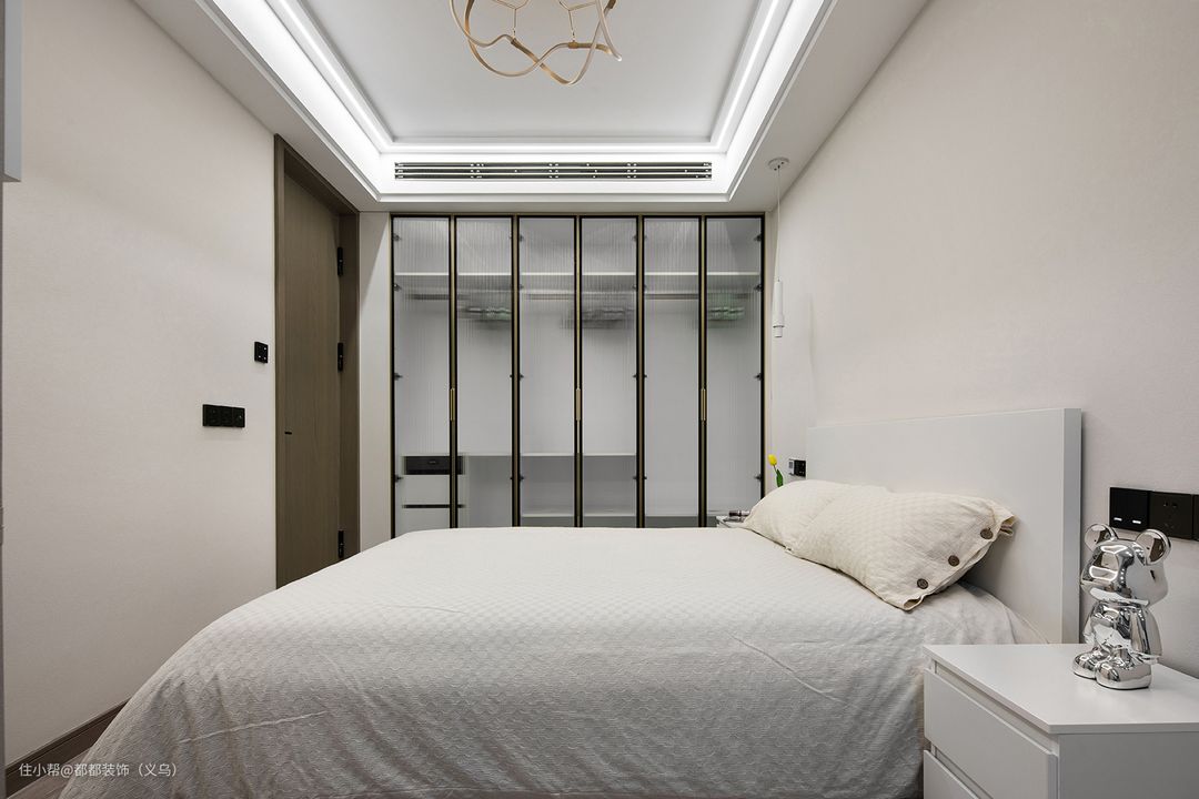 长辈房的整体空间设计比较简单没有过多和复杂的造型,尽量简单简洁为出发点,全屋米色的空间舒适又温馨,定制衣柜采用玻璃门设计,储物收纳一点没少。