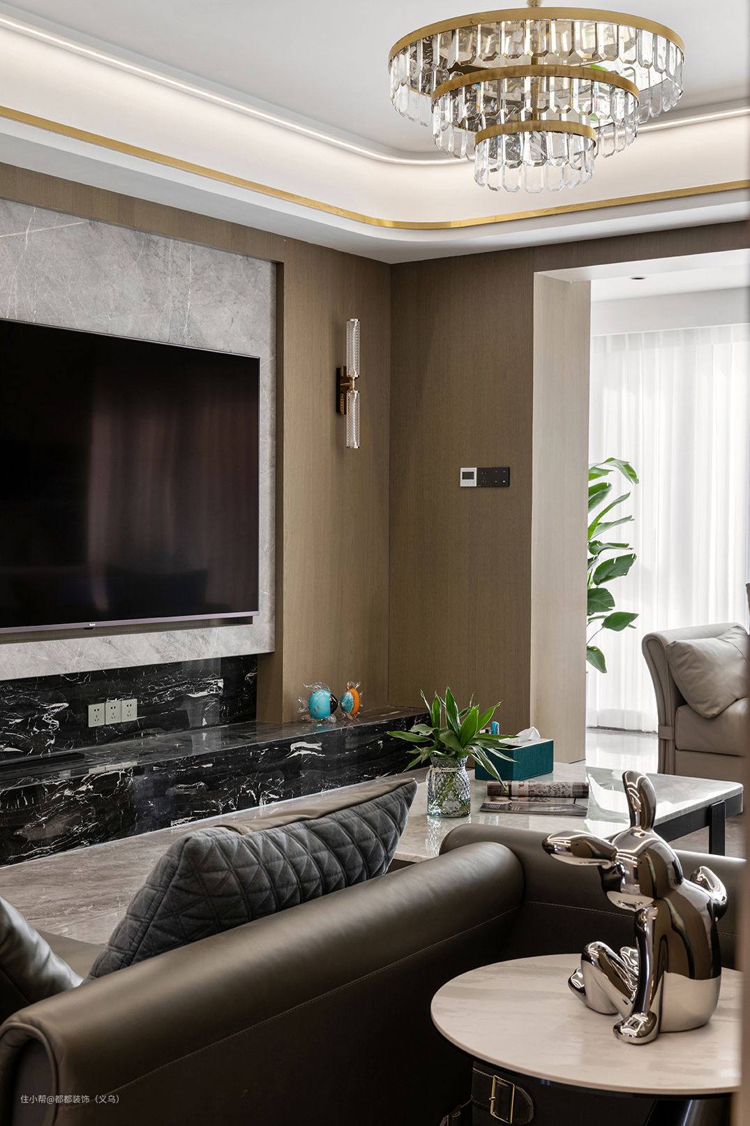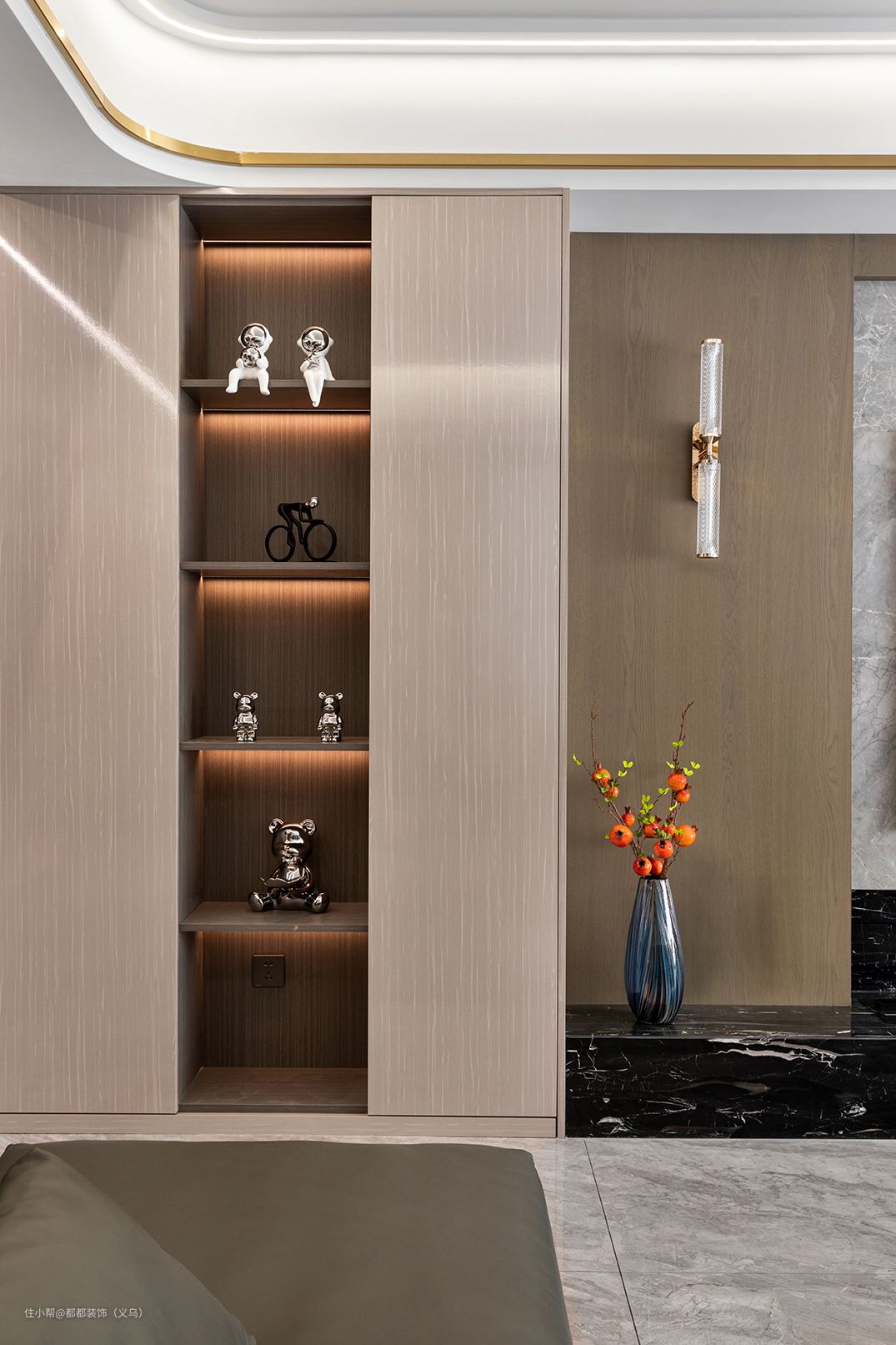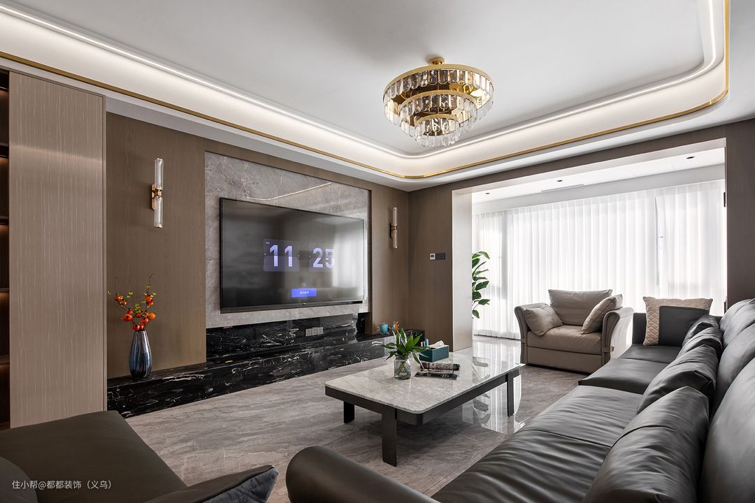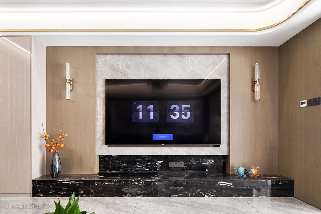电视背景墙采用木饰面为大色块,内嵌式银白色+轻奢黑大理石设计减少了画面的单调感,带有镭射光泽的玻璃瓷瓶中,小石榴树枝静静矗立,中式花果之美气韵尽显。