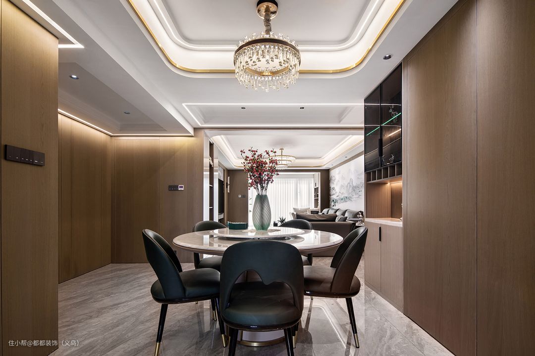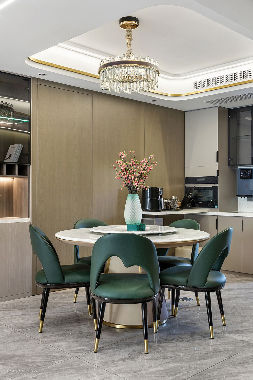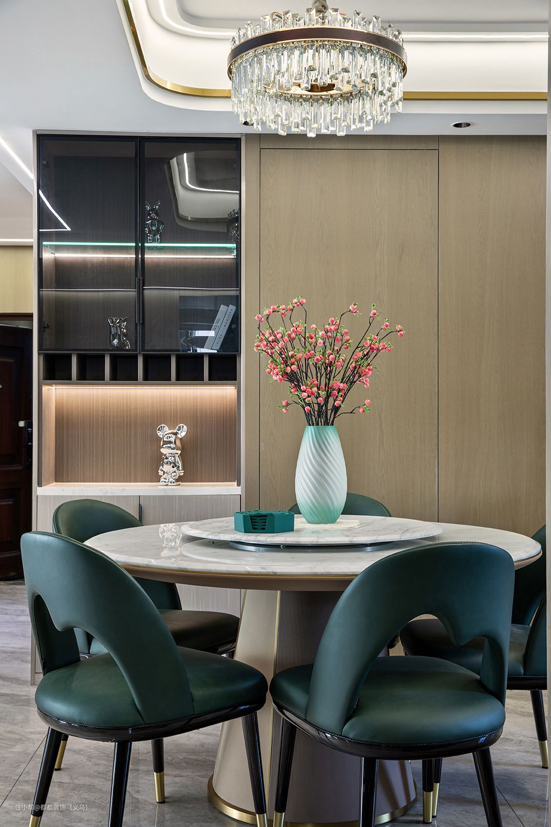在餐厅中,圆弧线条无处不在,双层圆形岩板餐桌、橄榄绿色的软包餐椅,流畅的弧线中和直线的生硬,粉嫩的腊梅花营造着空间温馨舒适的氛围。