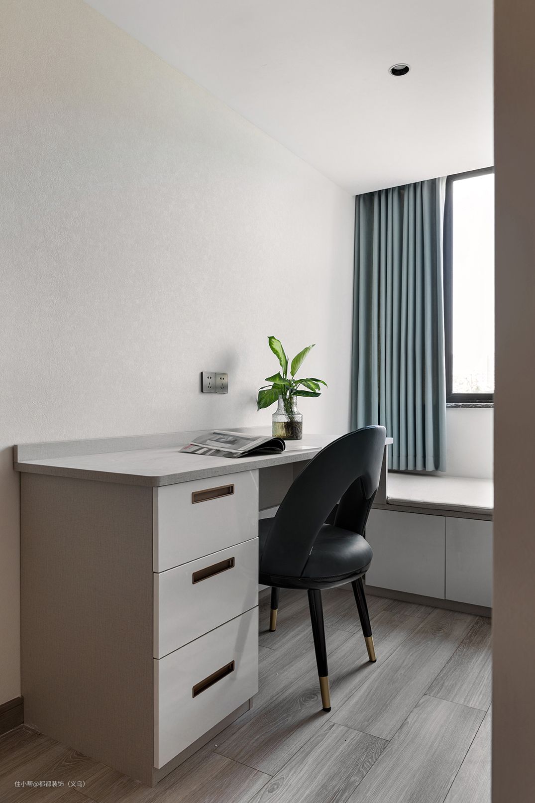 靠窗处放置了黑白调的书桌椅,洁白的墙面可以做为全家后期所有照片的展示,每一个时间段的美好回忆都可以记录在这里,幸福又美好。