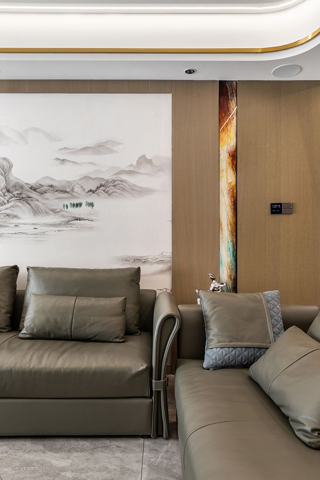 客厅空间层高适中,整体恢宏的气势搭配清雅的灰色系,形成一个奢与柔的反差,原木材质的墙面带着得天独厚的温润气质,与山水画遥相呼应。