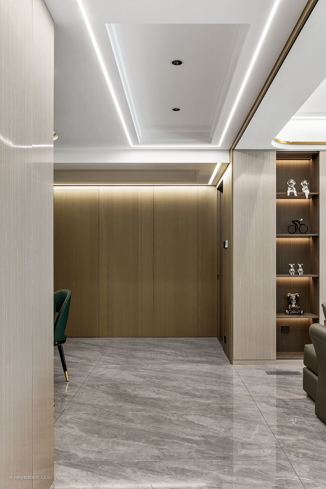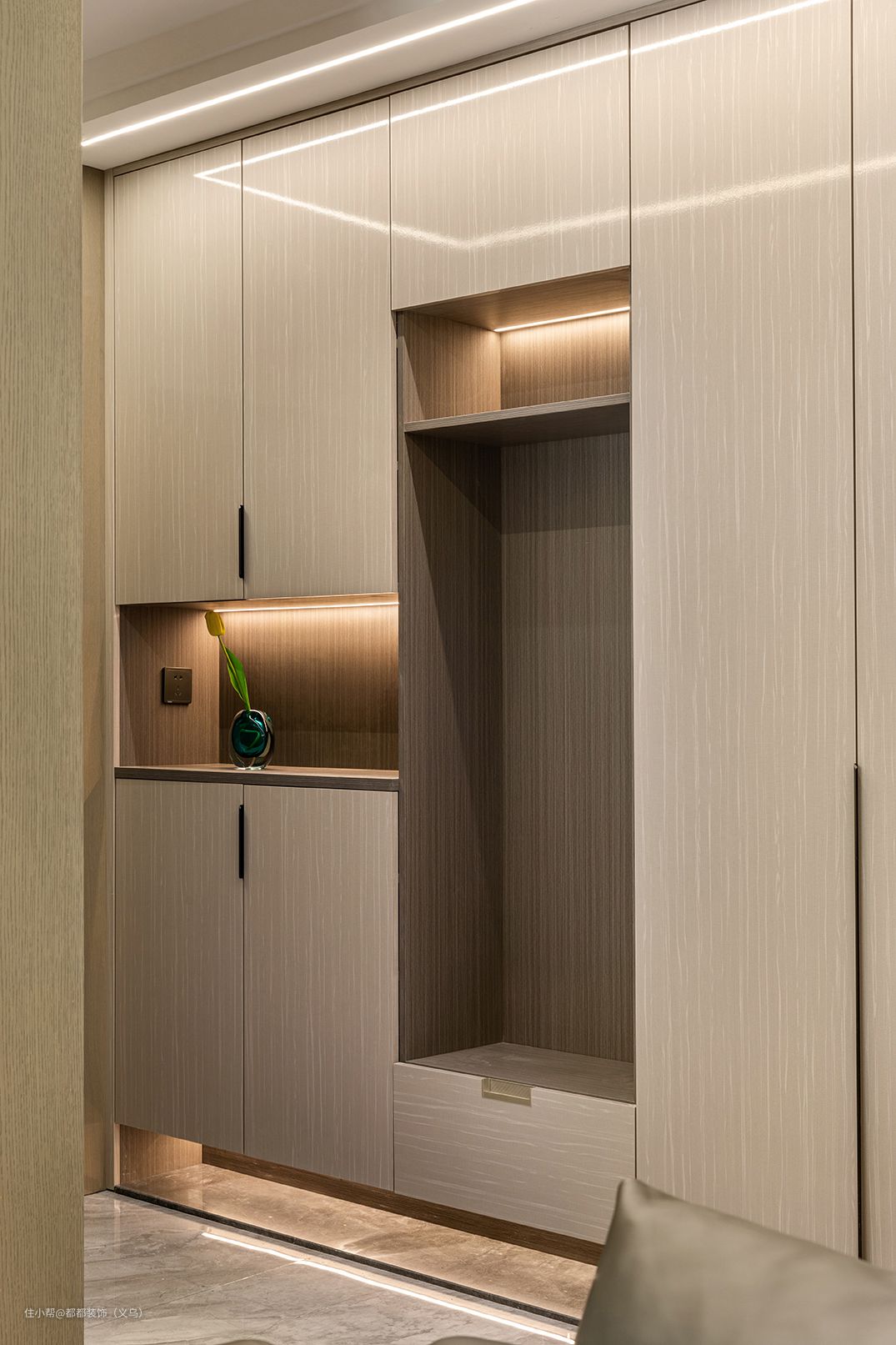 室内大量运用原木装饰,搭配温润的灯带点缀,将室内与自然的距离无限拉近,整合式玄关空间有功能强大的定制柜体,半开放式的设计既避免了开门见厅的尴尬,也尽最大可能的改善区域采光,开启入户仪式感。