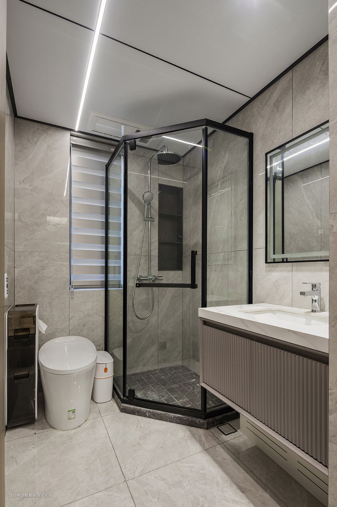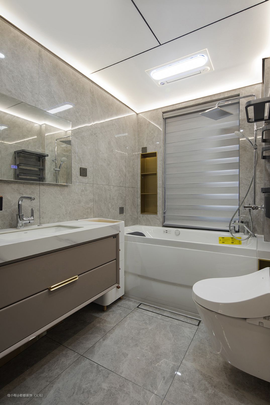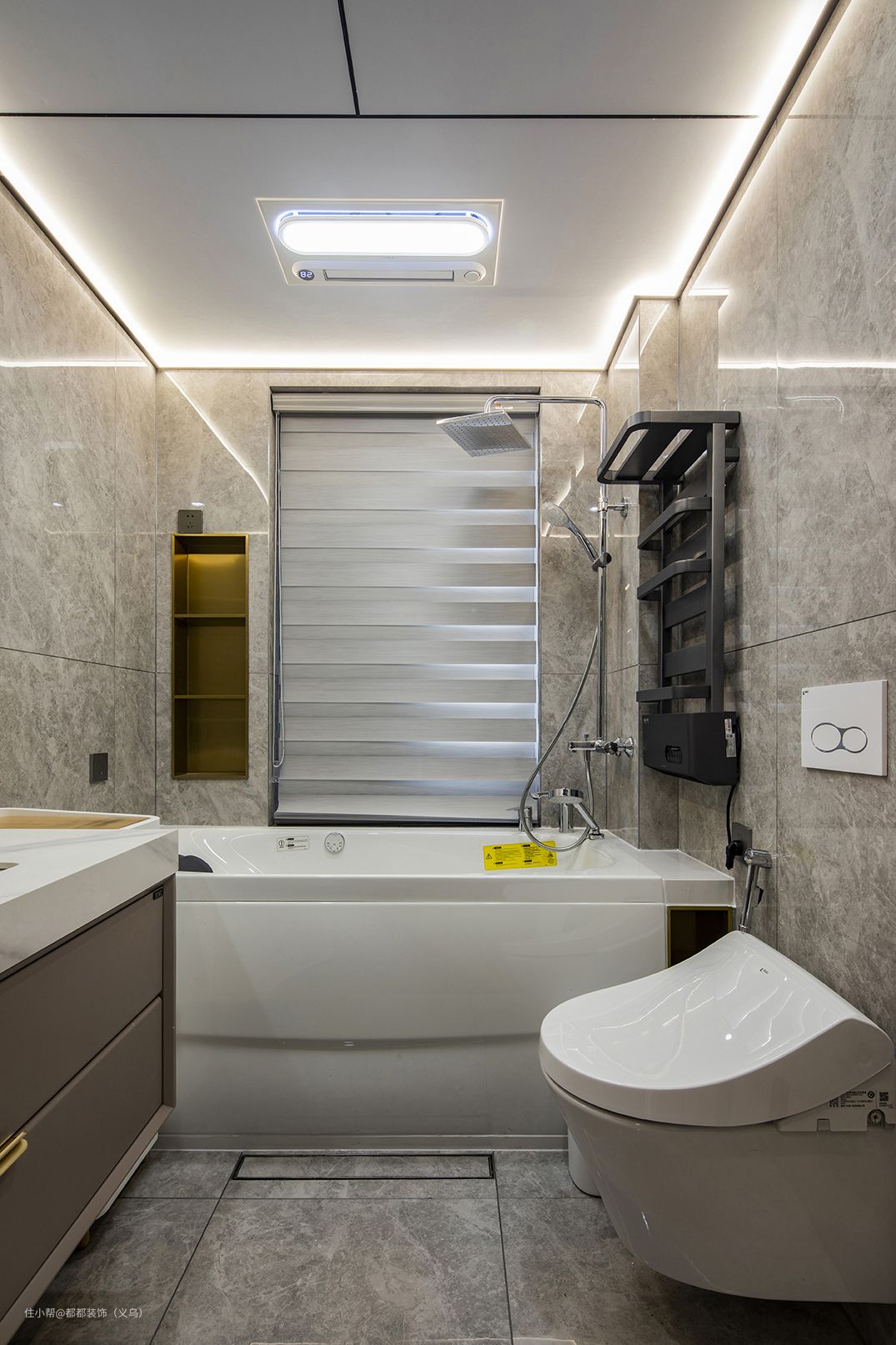 卫生间部分是标准的灰色系,主墙体和地面都是采用的釉面瓷砖,地面瓷砖在使用时自带防滑功能的哦,卫浴缸+淋浴组合设计深得人心,壁龛上后期配点小音箱、蜡烛或者香薰等,泡在暖暖的浴缸里,这样的度假小情调直接满分!