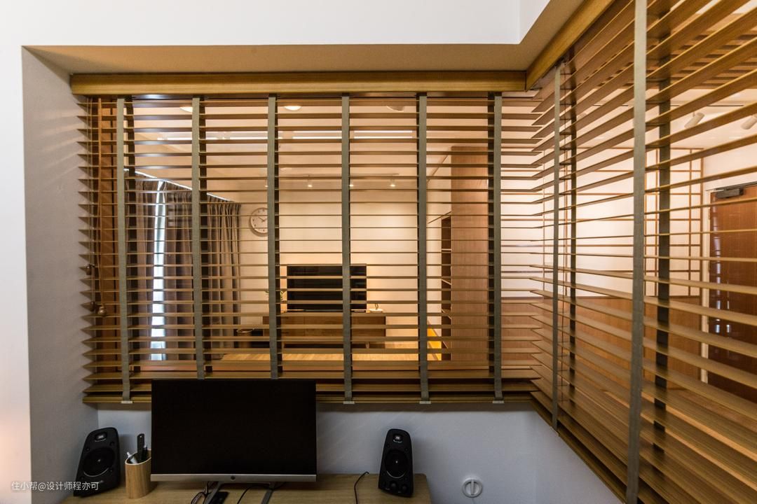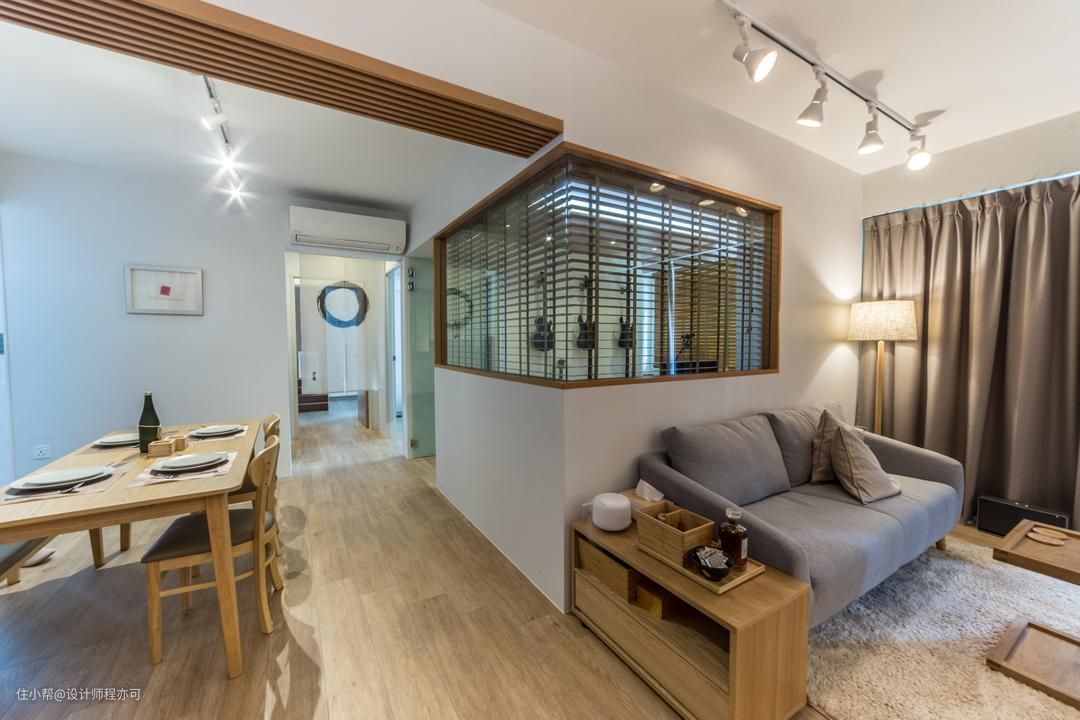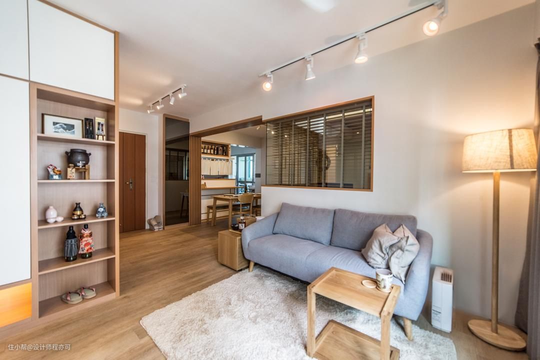 沙发背景墙设计了半扇玻璃墙隔断,搭配浅灰色的沙发与侧边原木小茶几,简约温馨。