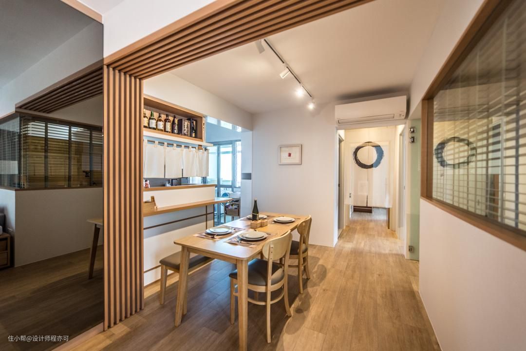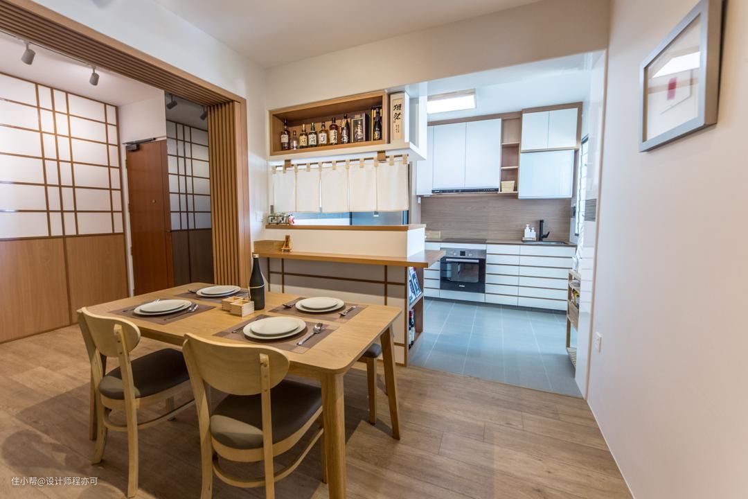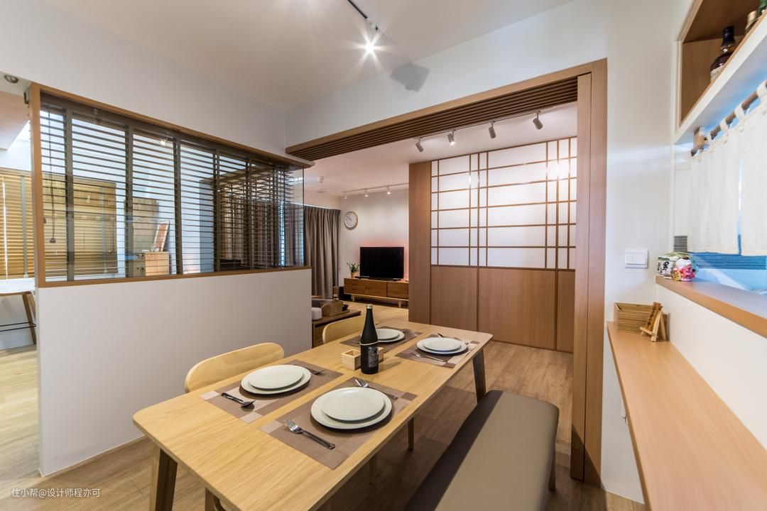 餐厅定制长凳与餐桌平行布局,原木+白色墙面,配合着柔和的木色暖调,餐桌摆放整齐精美的餐具,让每一次用餐都充满着仪式感。