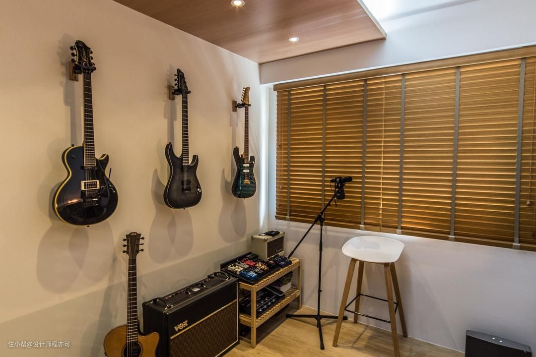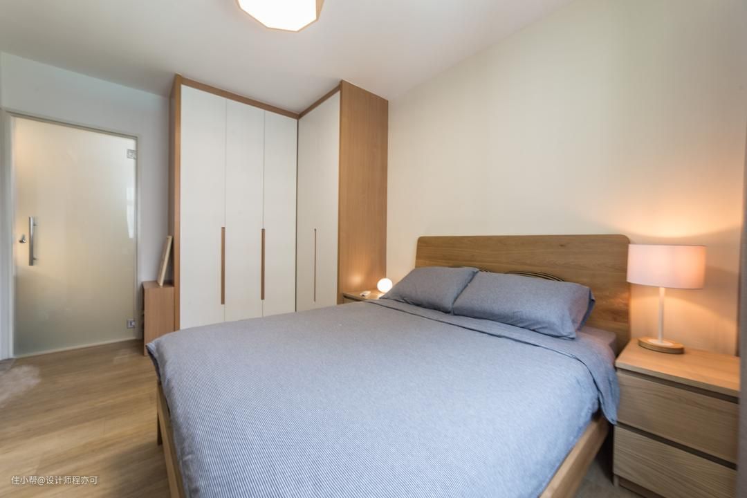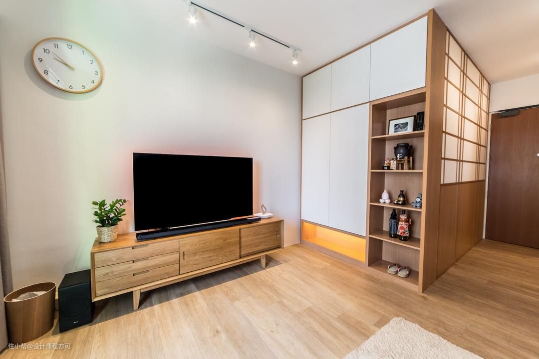 客厅整体采用了原木色,木质地板与家具和背的墙面进行连接。无主灯设计,射灯辅助照明,沙发一旁搭配一个暖黄色立式台灯,给人一种贴近自然又带点舒适的感觉。
