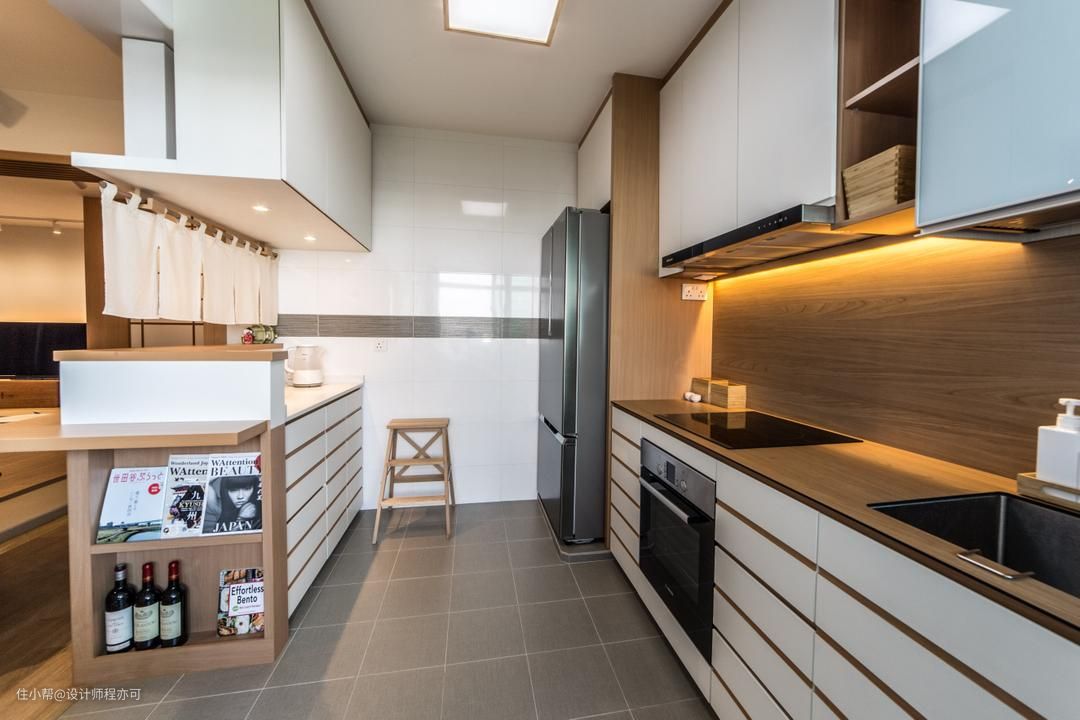 厨房通铺灰色哑光方格墙砖,搭配原木橱柜,白色的柜门,整洁简约,开放式的设计十分的大气。一字型台面设计,白色大理石台面整齐洁净,内嵌家电实用方便。