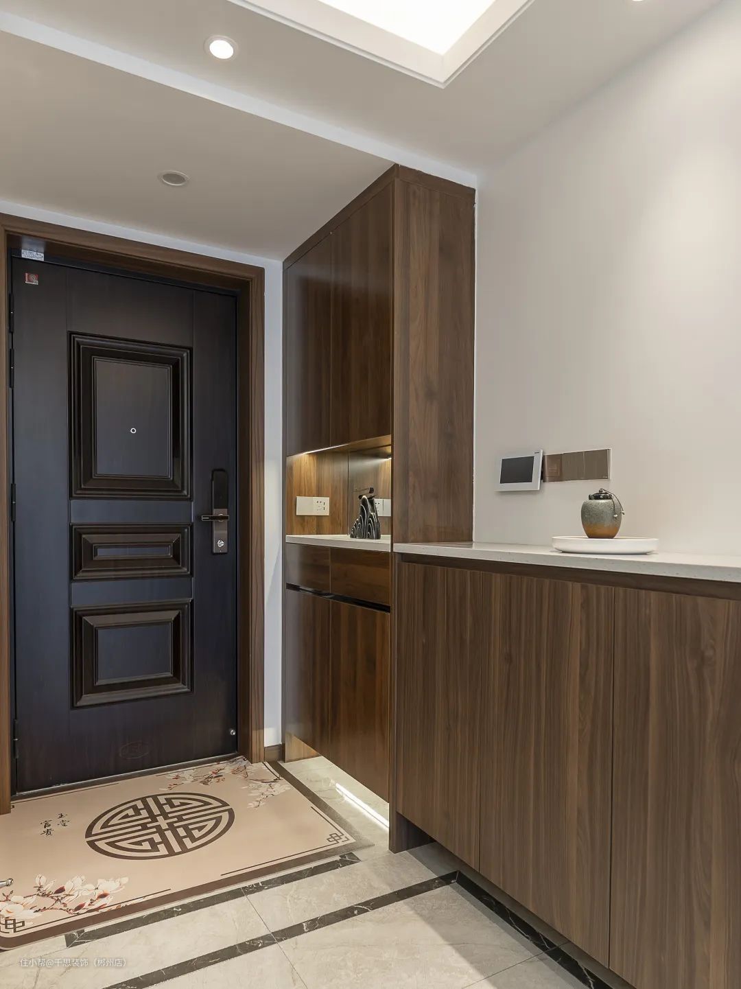 玄关柜由通顶高柜+矮柜组合而成,矮柜台面可放置包包、钥匙等物品,并在上方墙面安装插座,底部均预留了20公分用来换鞋。