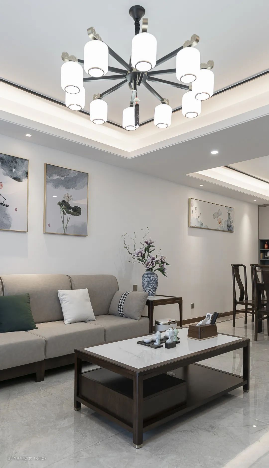 两张客厅细节图:细节之处见真章,一盏10头新中式吊灯,中式韵味流淌在全屋之中。