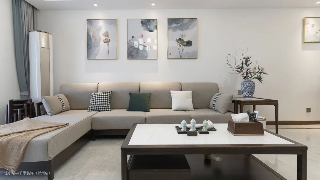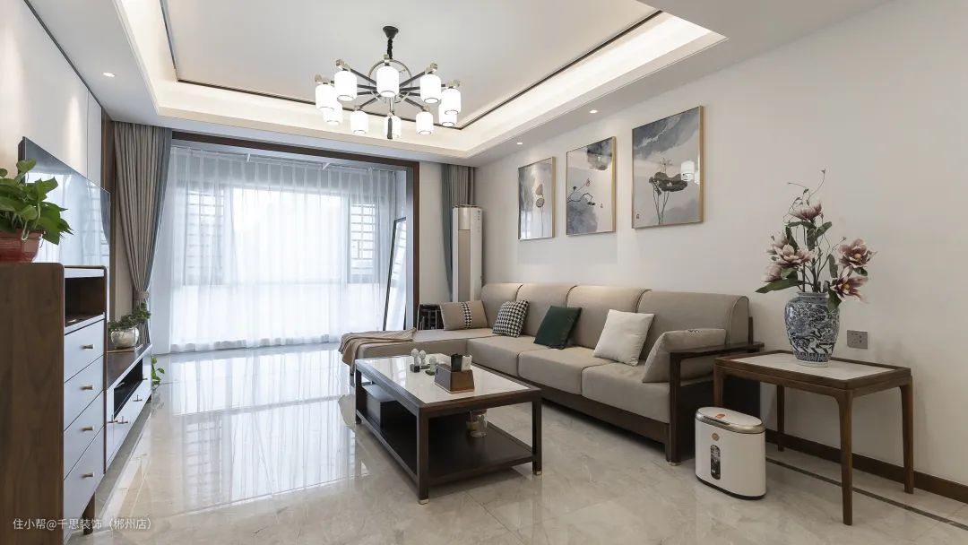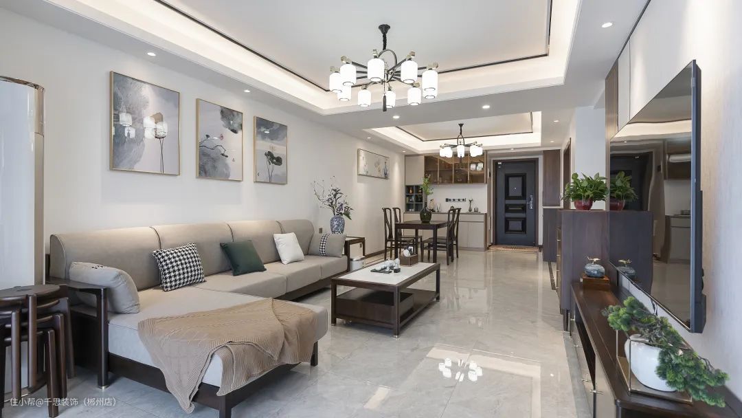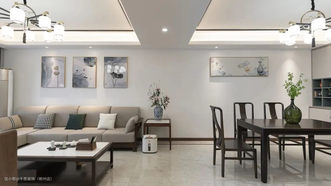 整体灰白+木色的空间基调,中式古灯与线性灯源为空间提供照明,暖光下的浅色沙发与实木家具,渲染出古典优雅的即视感。