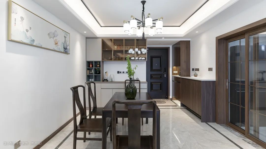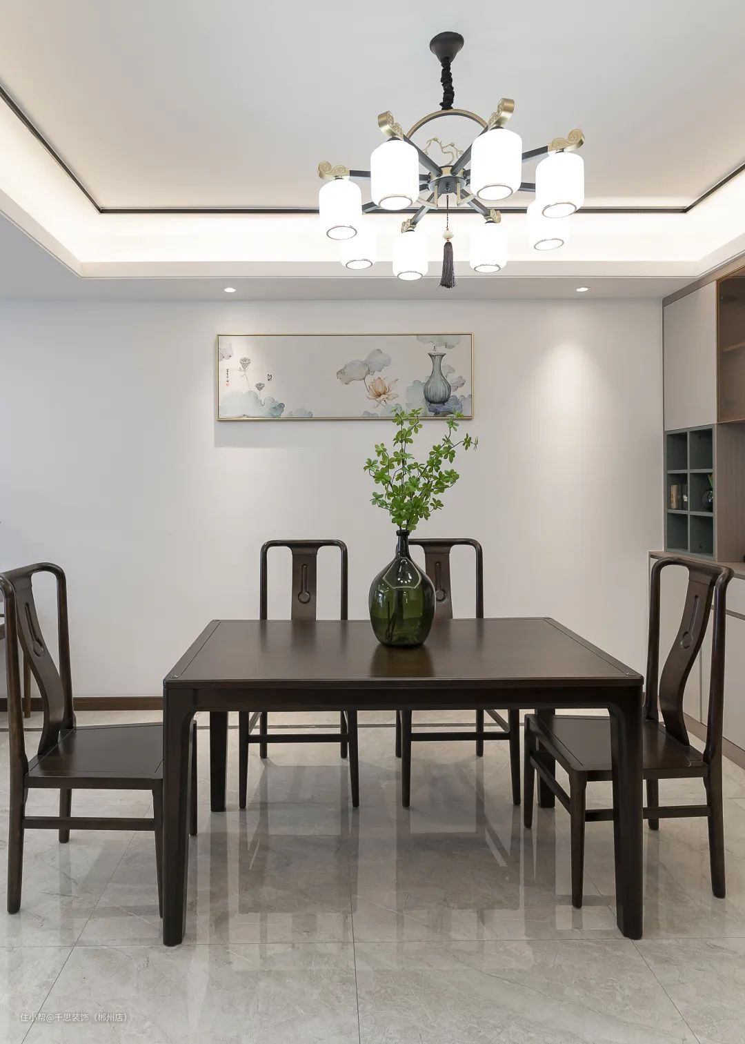 餐厅主色调选用棕褐色,延续客厅同系列背景装饰画,展现别致的优雅氛围。简约稳重的中式实木家具,赋予空间文墨香气。