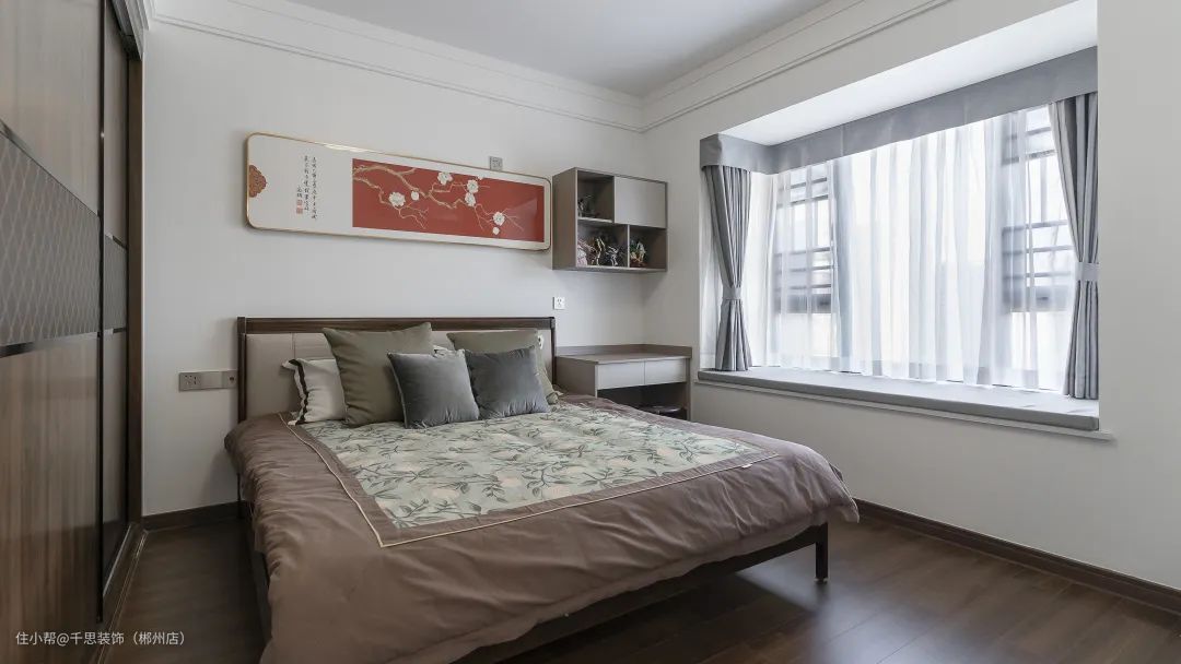 深色木地板通铺至整屋,营造空间的典雅时尚,中式韵味十足。保留飘窗设计,飘窗上做软垫,整体营造清新雅适的就寝环境。