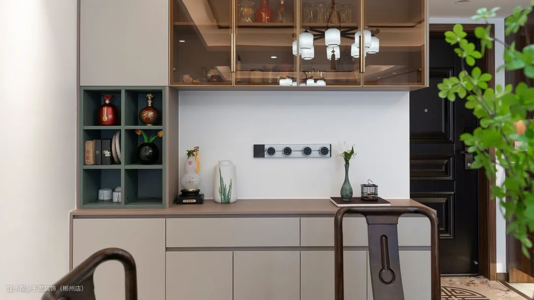卡其色餐边柜修饰单调的餐厅背景,有藏有露的柜体设计,结合玻璃柜与展示柜一体,为餐厅带来丰富实用的储物功能。
