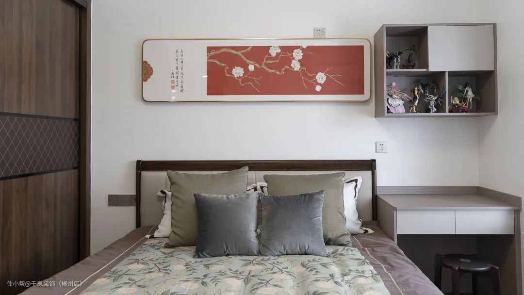 床头一侧,定制简约分体式书桌,吊柜做开放格+封闭格,摆置着收藏的心爱手办。书桌和梳妆台一体,方便业主偶尔在家办公需求。