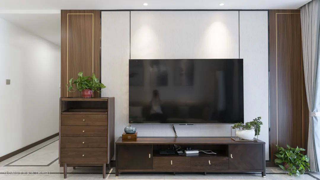 电视背景墙两侧做对称造型,木饰面护墙板沉稳大气,中间留白不做装饰。搭配上同材质的矮柜与电视柜,彰显出端庄、内敛的和谐之美。