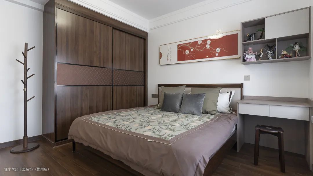 卧室以深色为基调,床头色彩斑斓的挂画,为空间注入活力与时尚。色调醇厚的实木衣柜,与树形挂衣架尽显木质温润之美。
