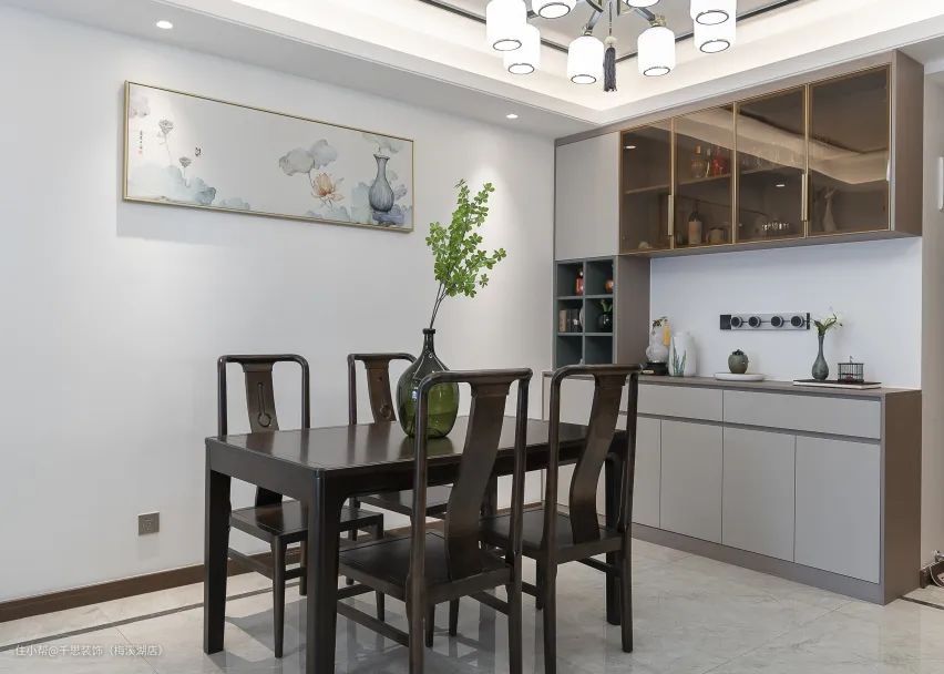 餐厅主色调选用棕褐色,延续客厅同系列背景装饰画,展现别致的优雅氛围。简约稳重的中式实木家具,赋予空间文墨香气。