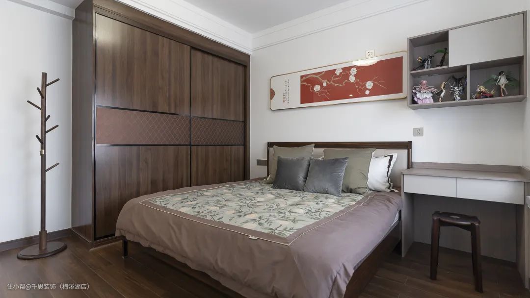 深色木地板通铺至整屋,营造空间的典雅时尚,中式韵味十足。保留飘窗设计,飘窗上做软垫,整体营造清新雅适的就寝环境。