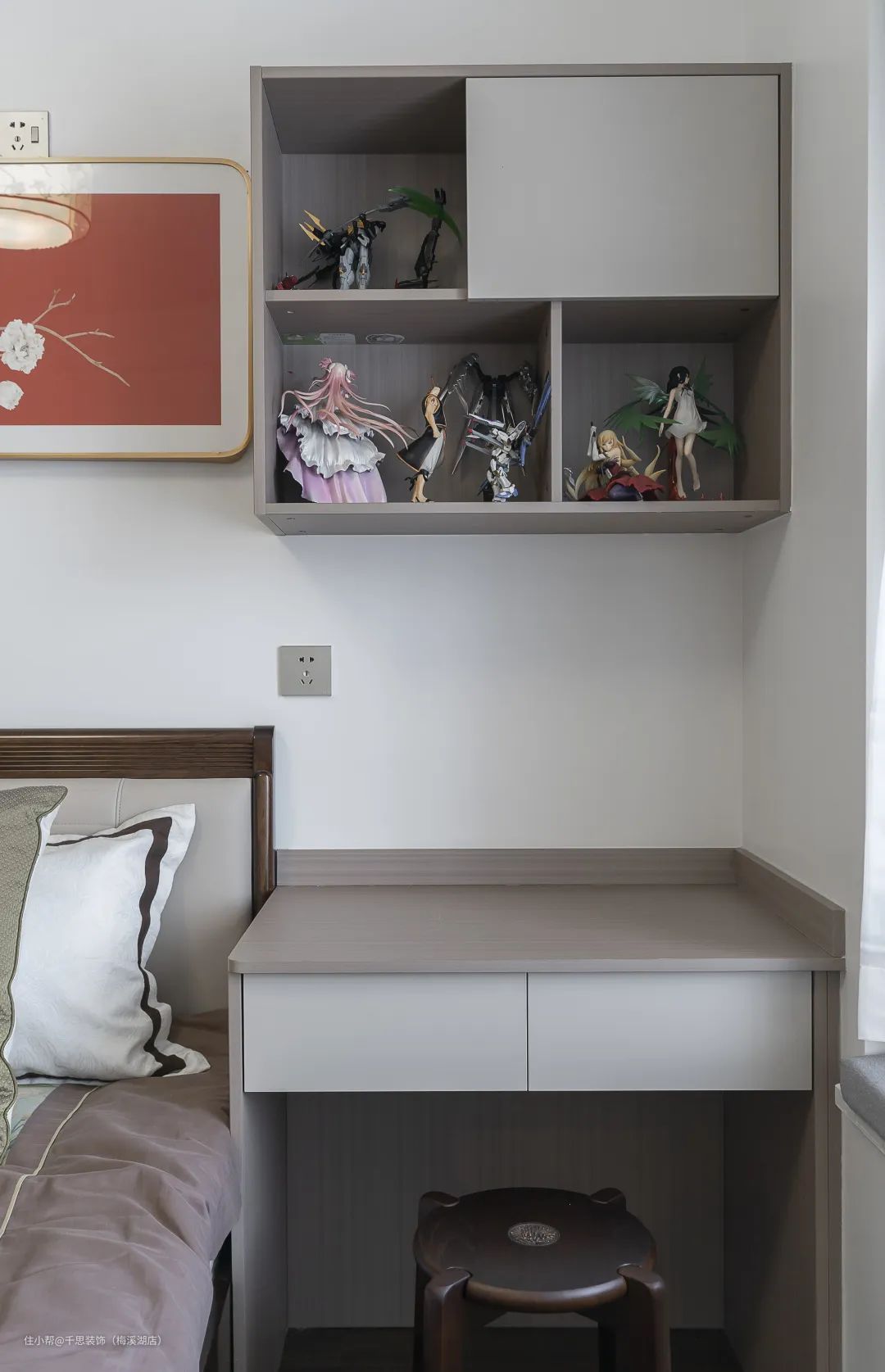 床头一侧,定制简约分体式书桌,吊柜做开放格+封闭格,摆置着收藏的心爱手办。书桌和梳妆台一体,方便业主偶尔在家办公需求。