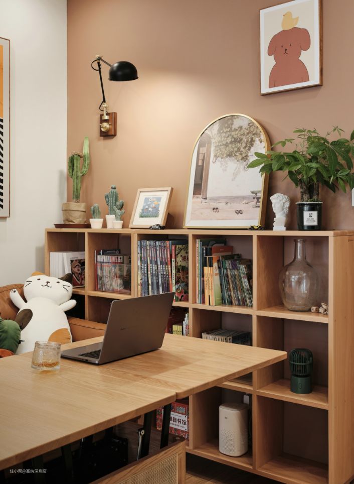 主卧划分出一间多功能客厅,解决了原来的老房没有客厅的问题,也让一家人拥有一个舒适的互动区域。这里既可以作为一家人休闲娱乐的客厅,也是父母办公的书房,孩子也可以在这里阅读绘本或者上网课等,这里可以伴随着家人需求灵活变化。