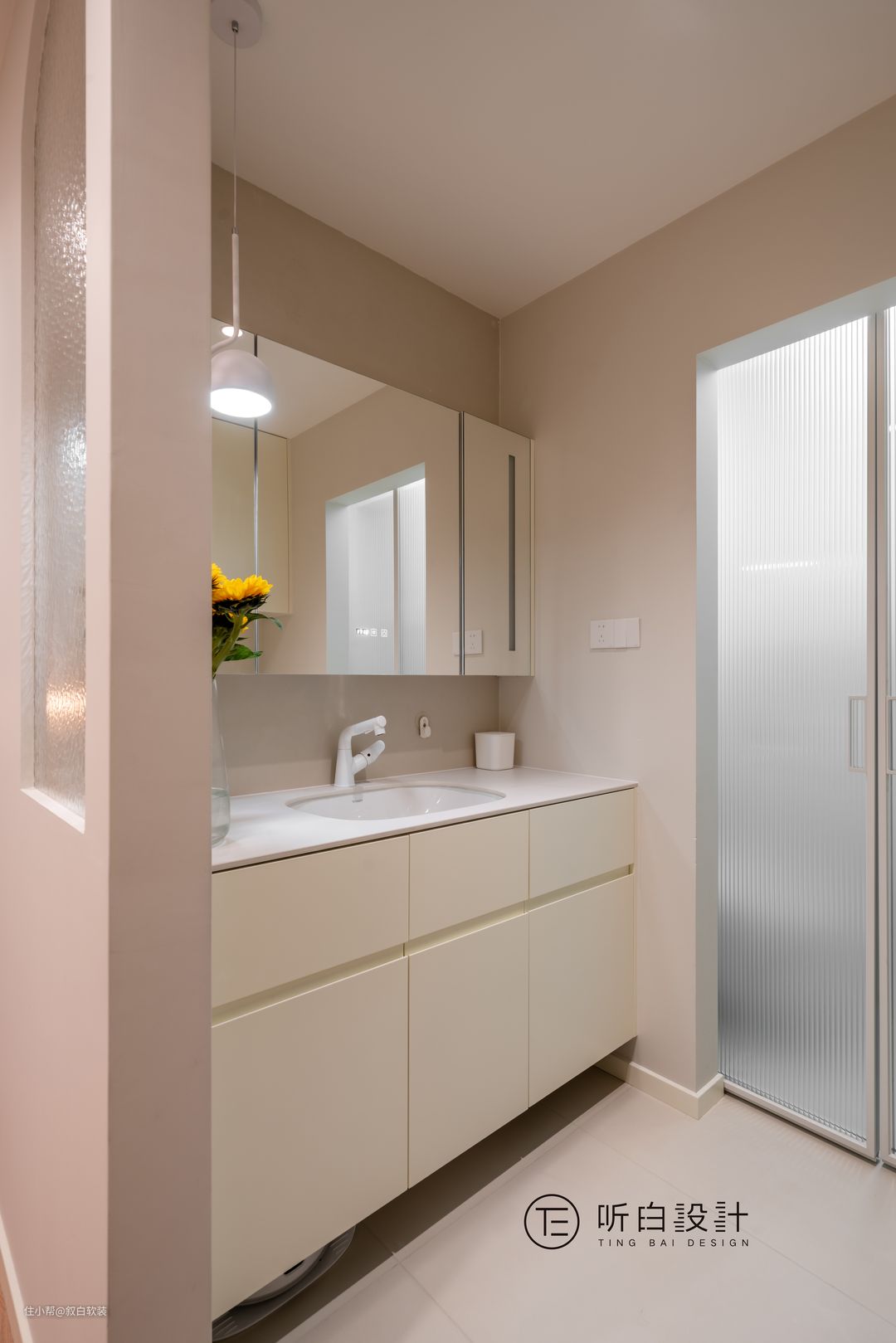干区洗漱区域的上方选择镜柜,下方用同色烤漆定制浴室柜。 镜柜的选择,增大的收纳的空间,同时智能镜面为小姐姐的洗漱和化妆提供便捷。 浴室柜的同色烤漆有着美丽的奶油色泽,和整体法式风格十分搭配。柜子悬空,左侧柜门下方专门留出扫拖机器人工作的空间。