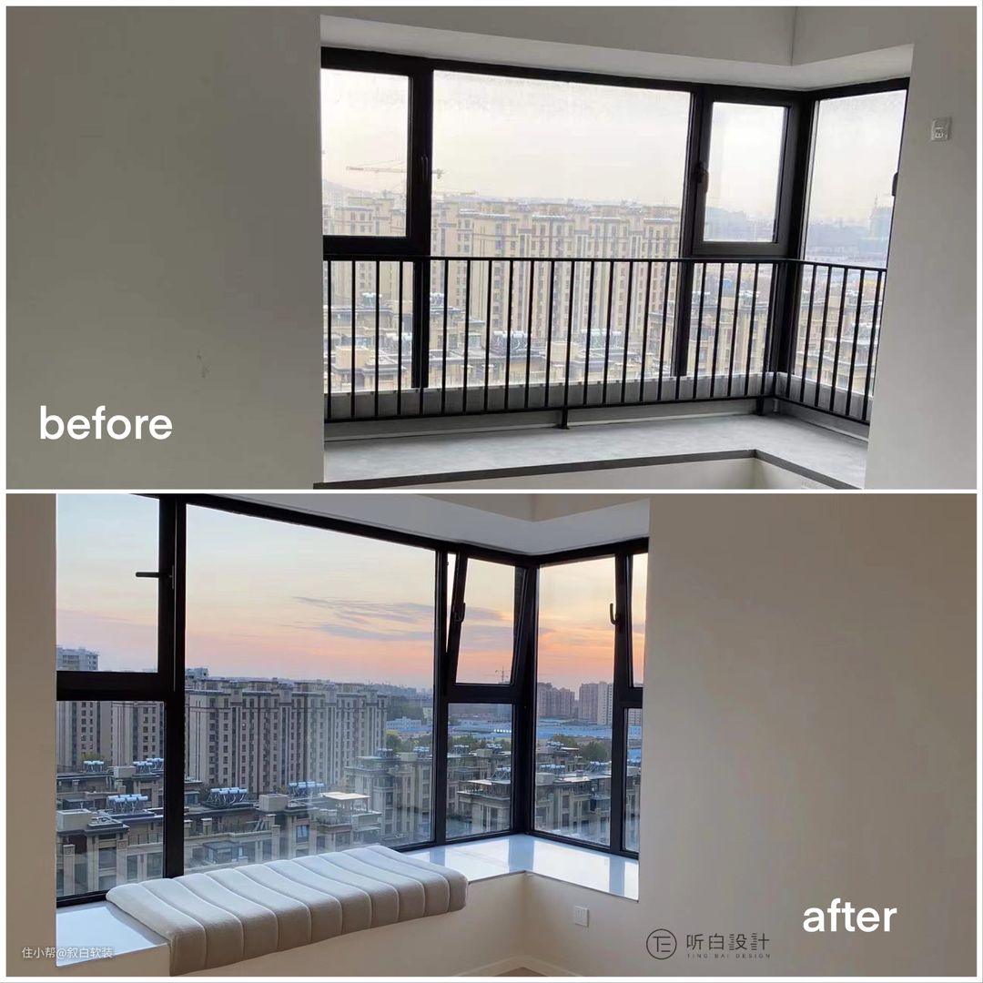 卧室飘窗的窗景迷人。 拆除栏杆,更换系统窗、窗台石和重新涂刷墙漆后,整个窗外的风景都如诗如画的让人沉醉。