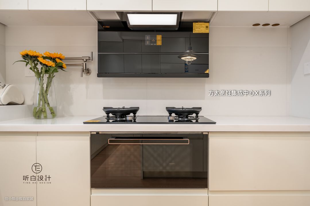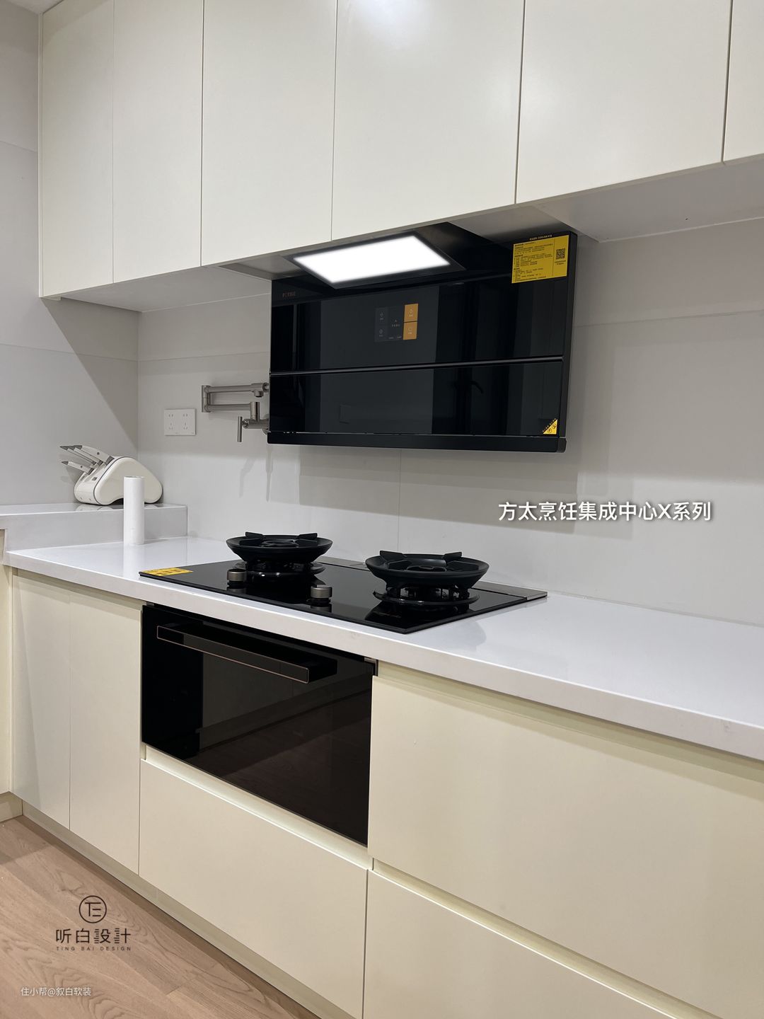 厨房除了日常生活之外,也是她重要的工作场景。我们为小姐姐做开放式厨房和隐形门,保证空间的通透感。 作为喜好烹饪美食的自媒体家居博主,分享烹饪过程就需要厨房出镜,所以小姐姐对于厨房颜值有很高的需求,因此烹饪电器不仅要功能强,美观性也是重中之重,经过精心挑选,方太集成烹饪中心X系列成为最优选择。 方太集成烹饪中心无需更改烟道,不切断台面和地柜,吊柜也可以作包柜,从上到下,完美嵌入吊柜和台面,和厨房的整体法式风格搭配在一起,更显高级。