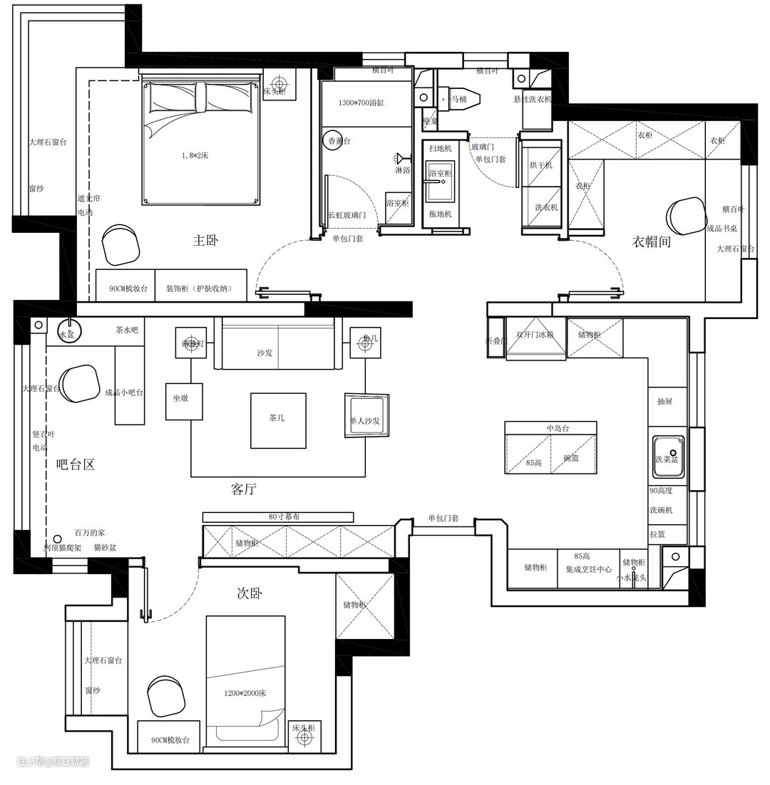 整体设计的核心是希望空间最大化,南北通透,有更好的采光和通风。 1、小姐姐是单身人士,一个人住,在刚开始设计的时候,我们就确定了主卧不要衣柜。 2、一个人住不需要两个卫生间,改造原始户型的两个卫生间做成三分离卫生间,解决两个卫生间都比较小,不能放下浴缸的问题。做成三分离还可以增加洗衣区,正好可以解决洗衣机放置的问题,让阳台变成我们的吧台,可以看书,可以工作,可以喝喝咖啡晒晒太阳。 3、小姐姐是美食爱好者,喜欢做饭,并做的非常好吃,所以一个超大的开放式厨房会更适合小姐姐的生活习惯。所以把原有厨房和餐厅打开,变成一个开放式厨房,做了隐形折叠门,敞开或者封闭自由切换。