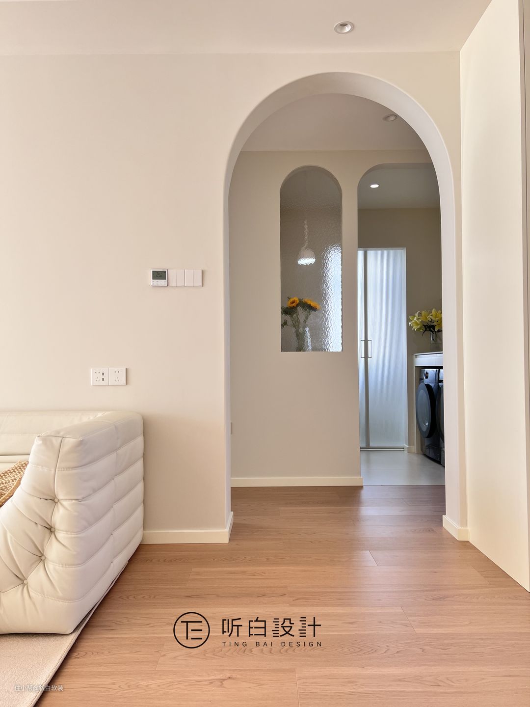 通往卫生间的动线,设计流行的法式圆拱门,和内侧的装饰圆拱形成递进的几何美感。 镶嵌的水波纹玻璃带来油画般的高级感,让这个小小干湿分离的洗手池空间,显现出艺术的美感。